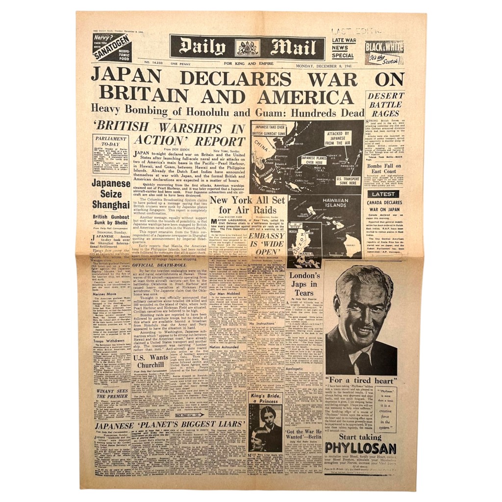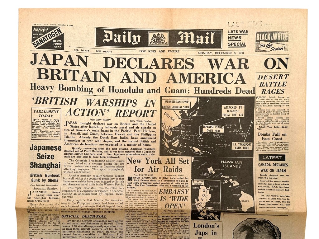Original WWII British Daily Mail newspaper – Pearl Harbor – Japan declaring war on Britain and the United States