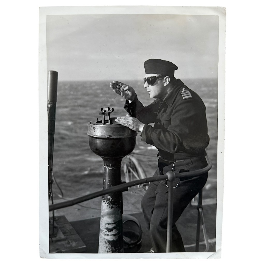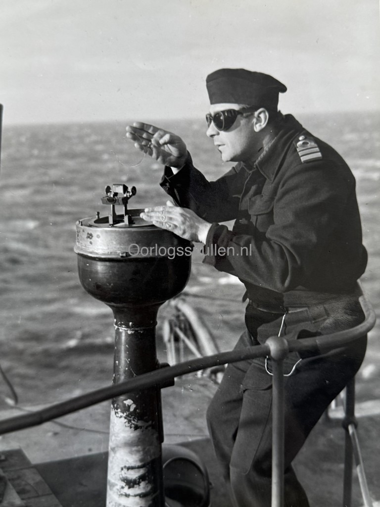 Deze Britse foto uit de Tweede Wereldoorlog toont een 1e officier van de Nederlandse Koopvaardij aan boord van een tanker, terwijl hij de gyrokompas afstelt.