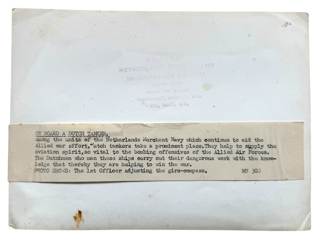 Op de achterzijde bevindt zich het originele persstempel van het Netherlands Government Information Bureau, London, samen met het begeleidende typoscript bijschrift.