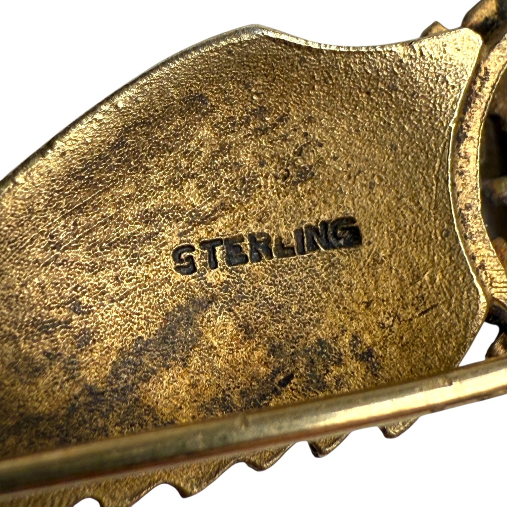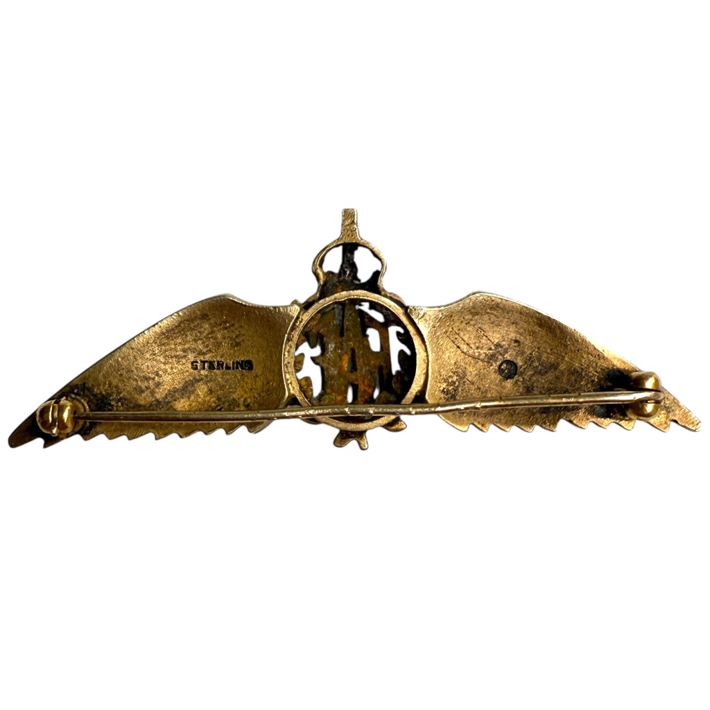 This British RAF badge from World War II is marked “STERLING” and features the classic winged crown with the central “RAF” monogram, the emblem of the Royal Air Force.