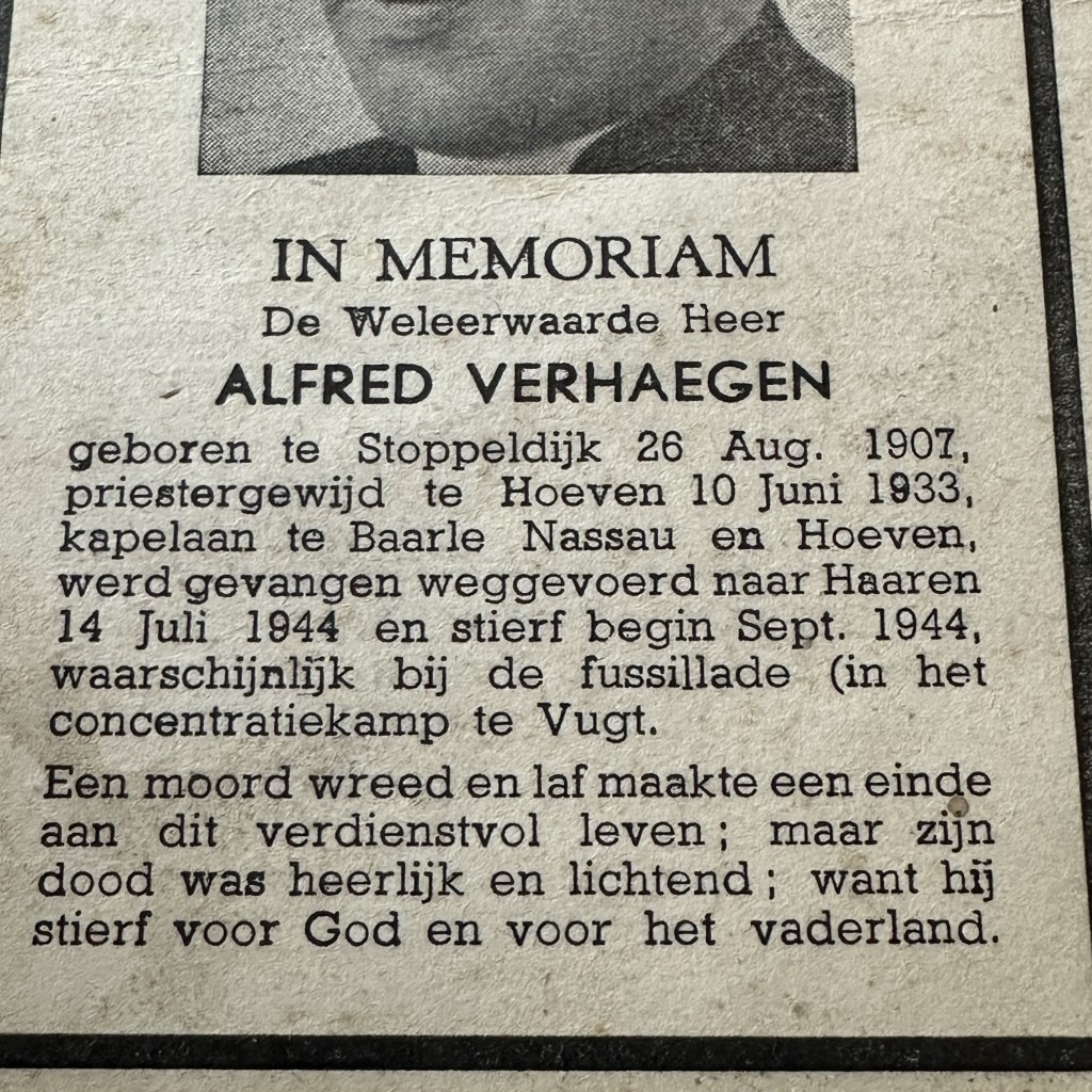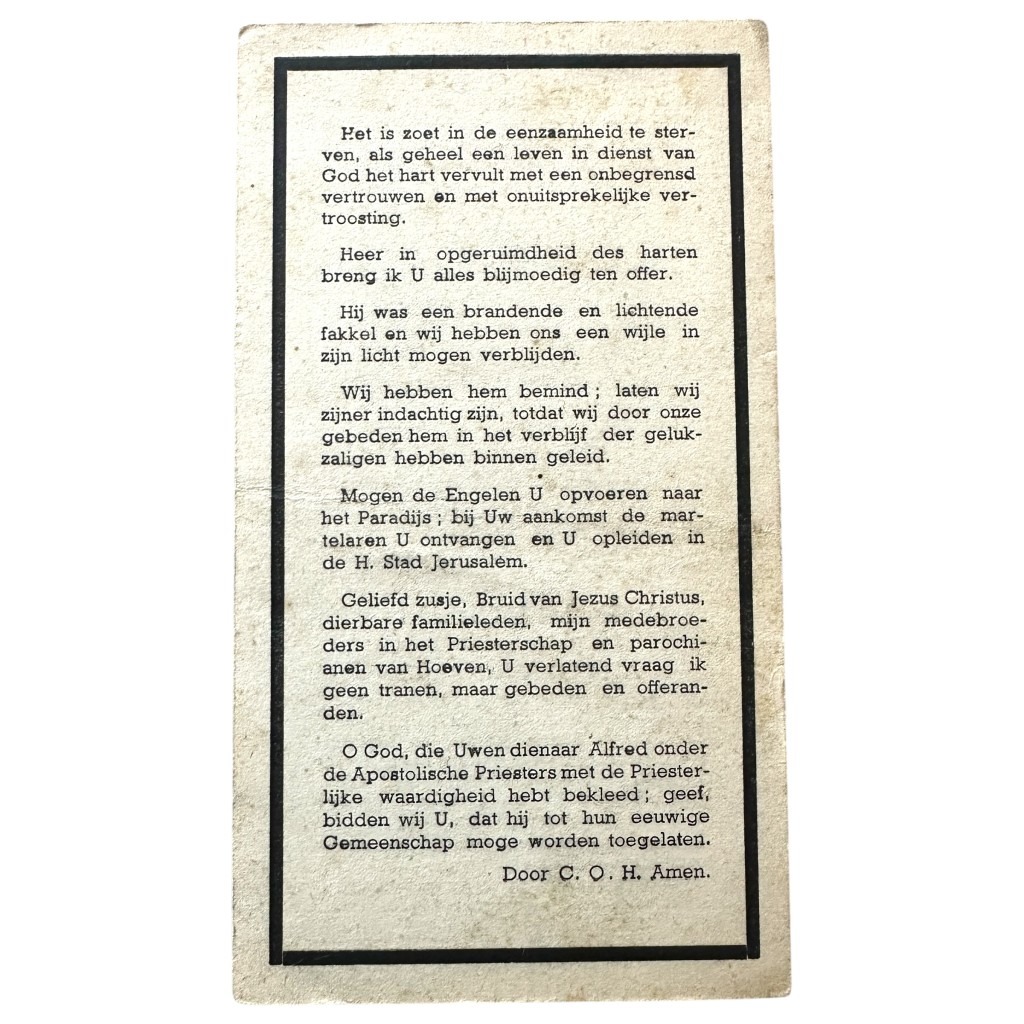 Dit Nederlandse bidprentje is in goede conditie en behoorde tot de verzetsman Alfred Verhaegen uit Hoeven welke lid was van het Nederlandse verzet en onderdak bood aan geheime agenten die uit Engeland gedropt waren.