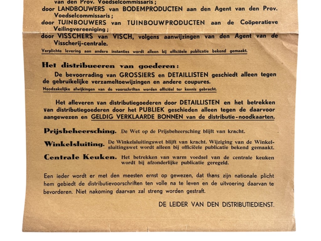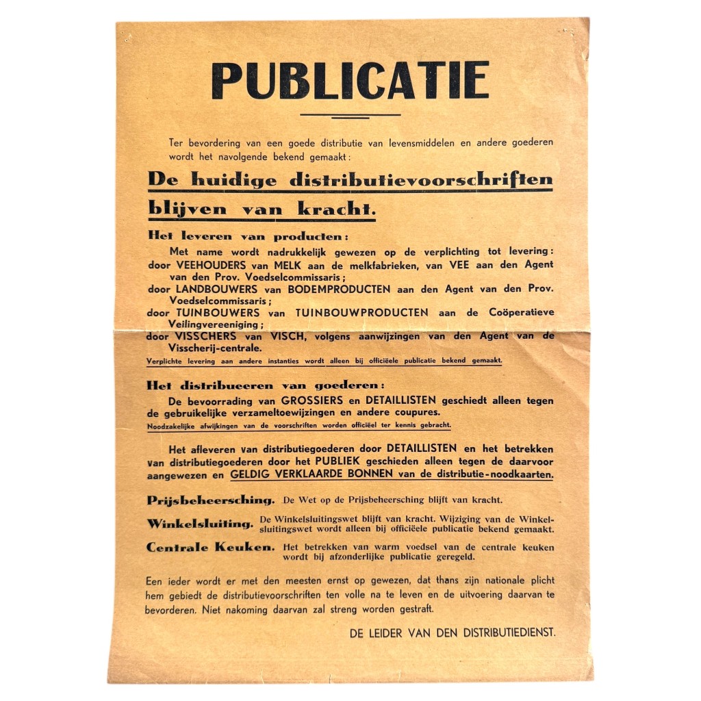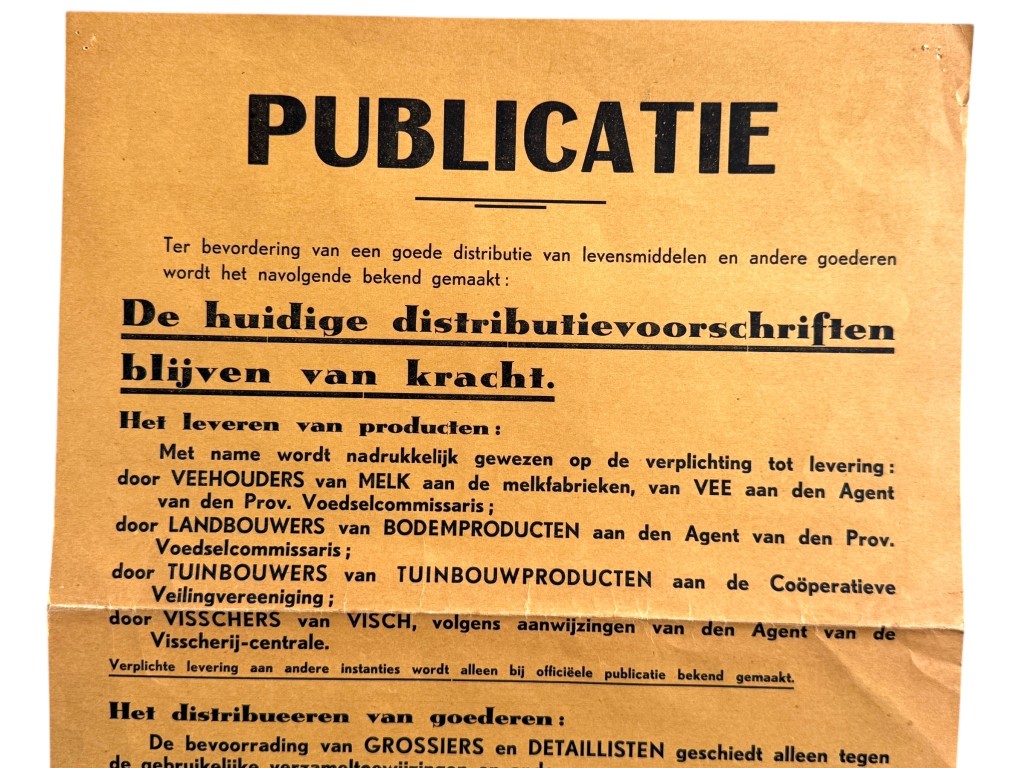 De poster richt zich tot boeren, vissers, tuinders en detaillisten en benadrukt de verplichte levering en strikte naleving van regels omtrent voedselvoorziening en prijsbeheersing in oorlogstijd. Onder het opschrift “PUBLICATIE” wordt uitvoerig toegelicht hoe de levering van melk, vee, landbouw- en tuinbouwproducten en vis moest verlopen, evenals de bevoorrading van grossiers, detaillisten en het publiek. Ook wordt gewezen op de geldigheid van distributiebonnen, de winkelsluitingswet en het gebruik van centrale keukens. De tekst eindigt met een duidelijke waarschuwing: naleving van de voorschriften is een nationale plicht, overtreding zou streng worden bestraft.