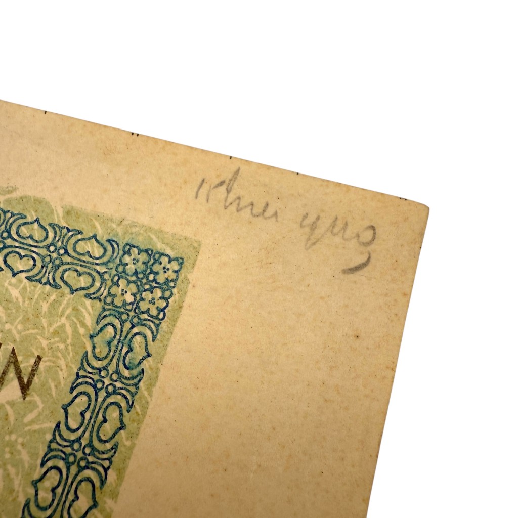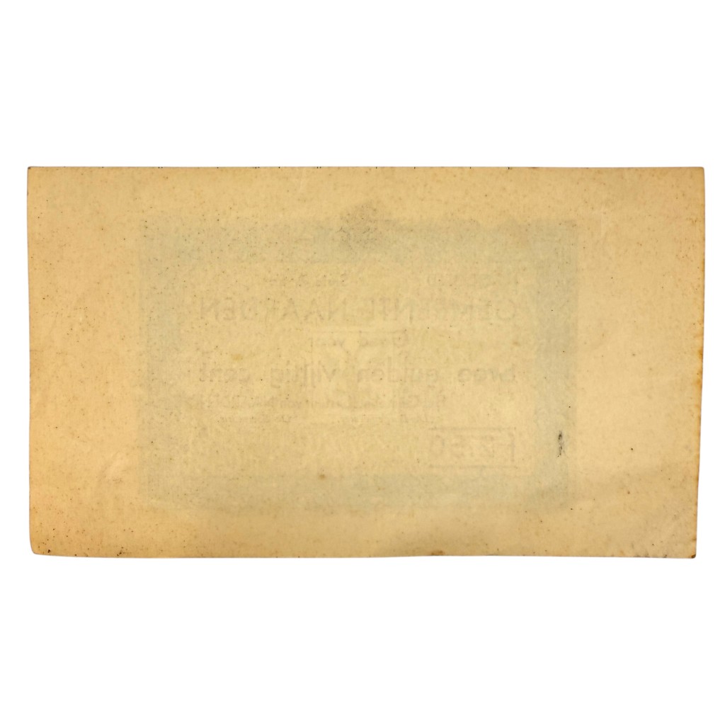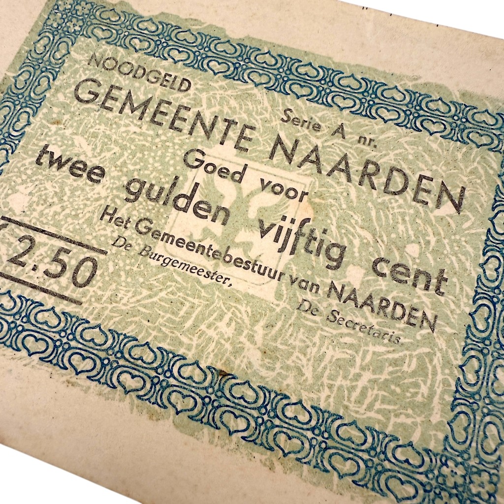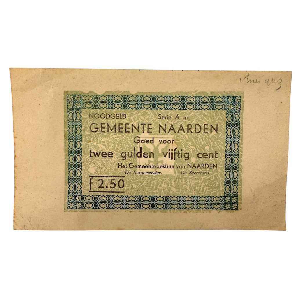 This Dutch emergency banknote was issued in May 1940 during the German invasion of the Netherlands by the Municipality of Naarden.