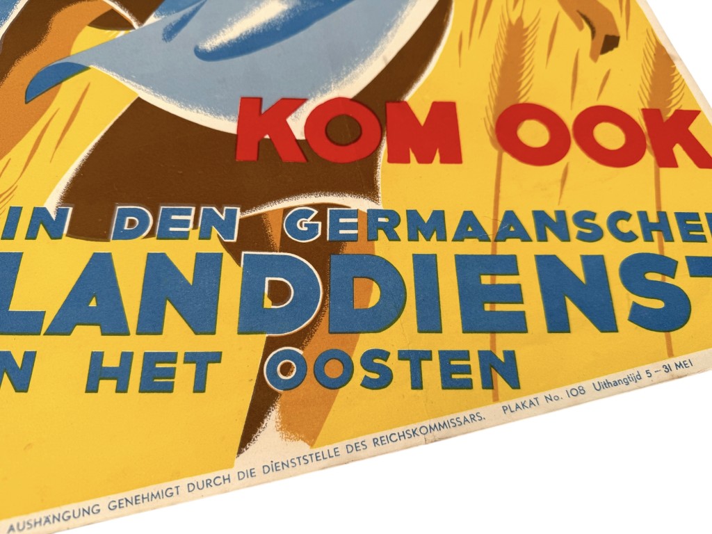 Deze collaboratie poster uit de Tweede Wereldoorlog is een opvallend en zeldzaam propagandistisch drukwerk voor de Germaansche Landdienst. De kleurrijke illustratie toont twee jonge arbeiders in een veld, ontworpen om jongeren te werven voor arbeid in het oosten. De slogan “Kom ook in den Germaanschen Landdienst in het Oosten” staat prominent weergegeven in rode en blauwe letters tegen een warme gele achtergrond, volledig in de herkenbare stijl van de bezettingspropaganda. Onderaan staat de officiële goedkeuring van de Dienststelle des Reichskommissars, evenals de aanduiding Plakat No. 108, met een vermeldde uithangtermijn van 5–31 mei.