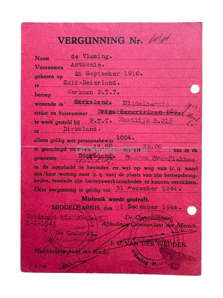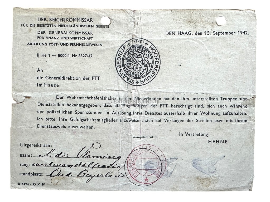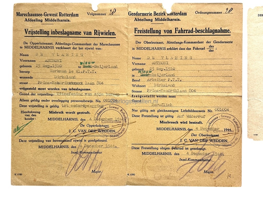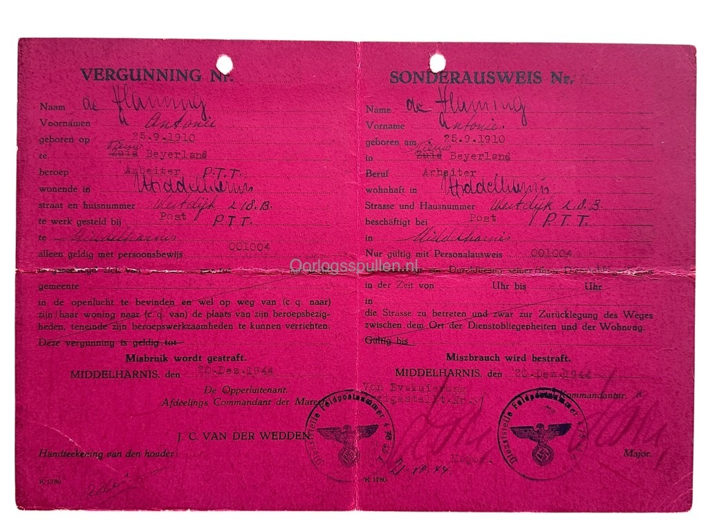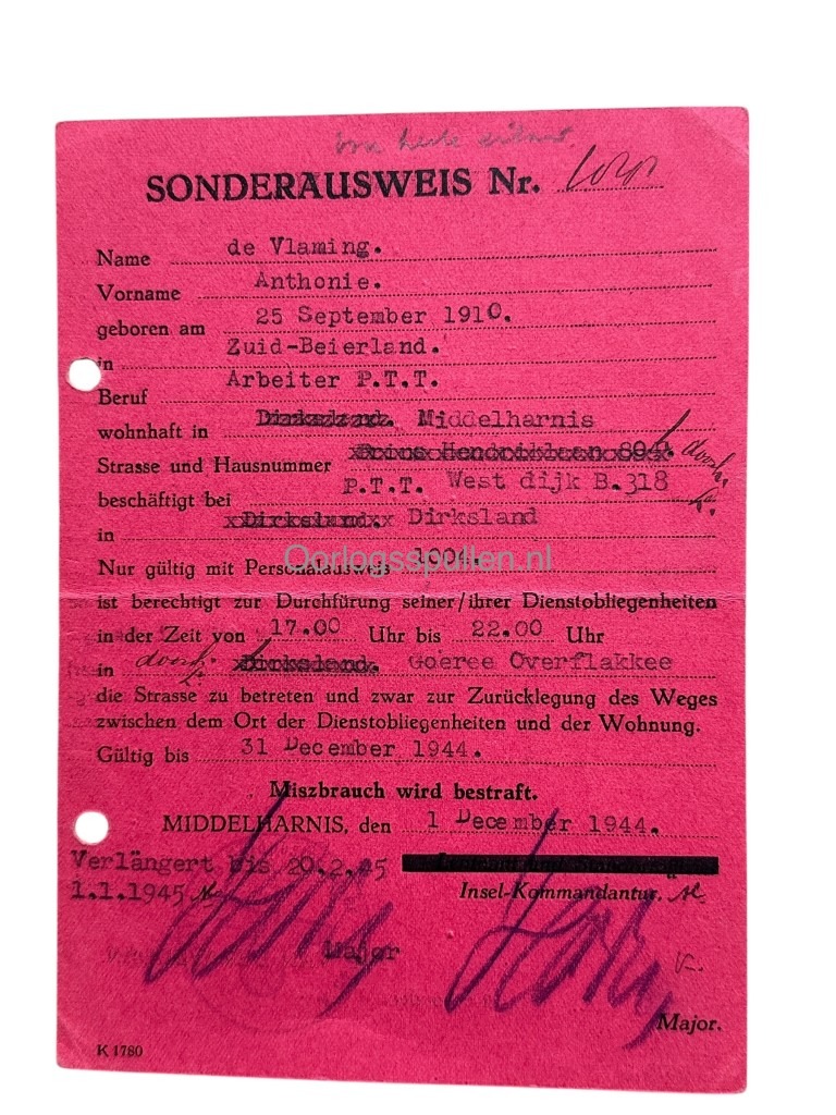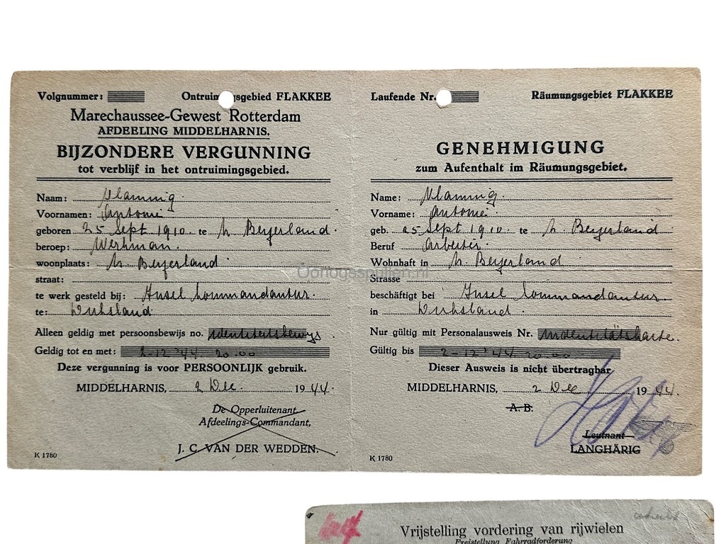 Hij was werkzaam voor de P.T.T. als elektricien en mocht in het ontruimingsgebied komen met deze passen.
