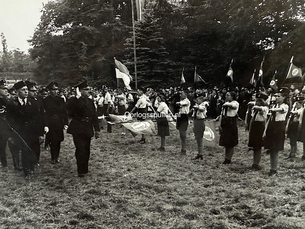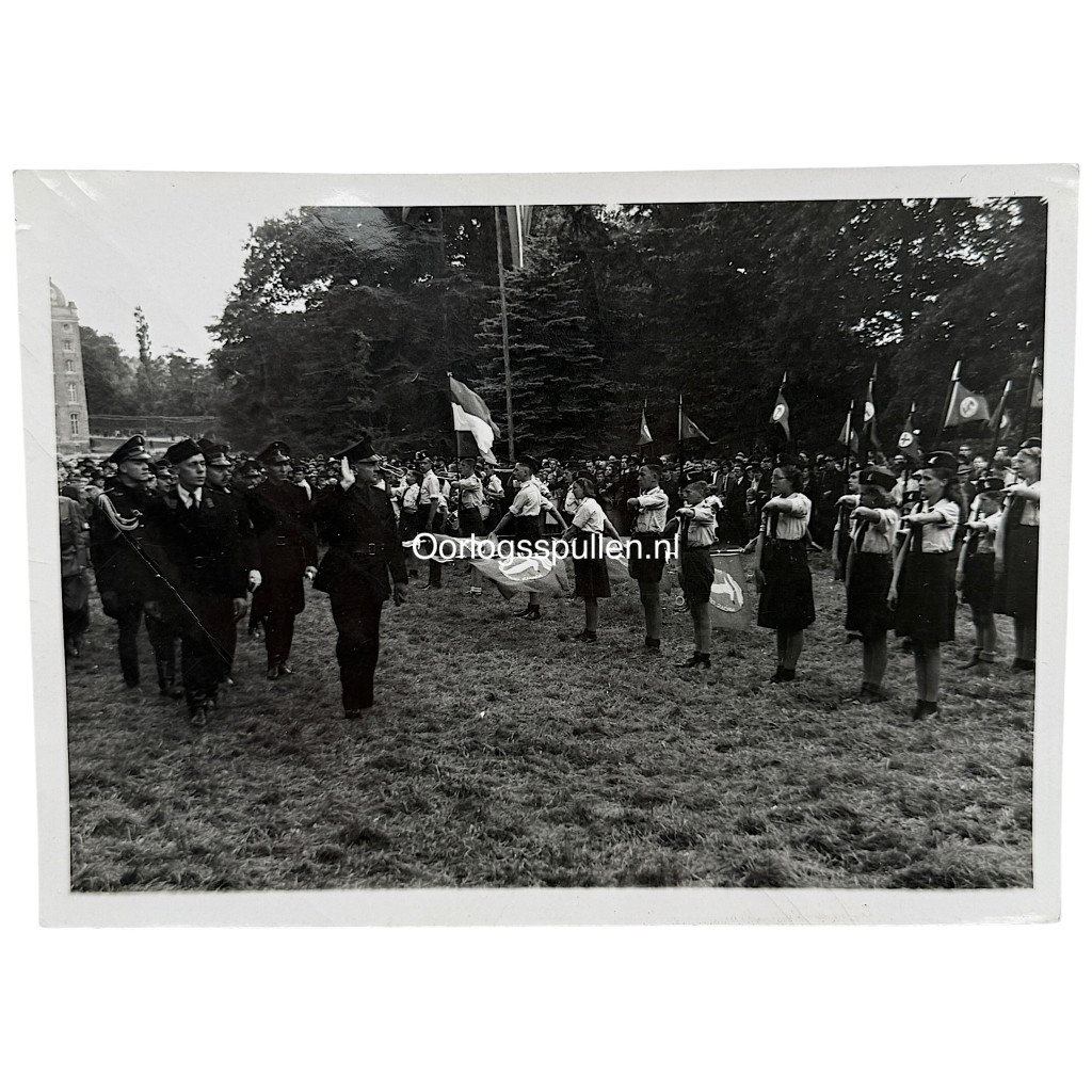 Op deze Nederlandse NSB foto (afmetingen 18 x 13 cm) is te zien hoe NSB-leider Anton Mussert een bezoek brengt aan een bijeenkomst van de Nationale Jeugdstorm (NJS), de jeugdorganisatie van de Nationaal-Socialistische Beweging in Nederland.