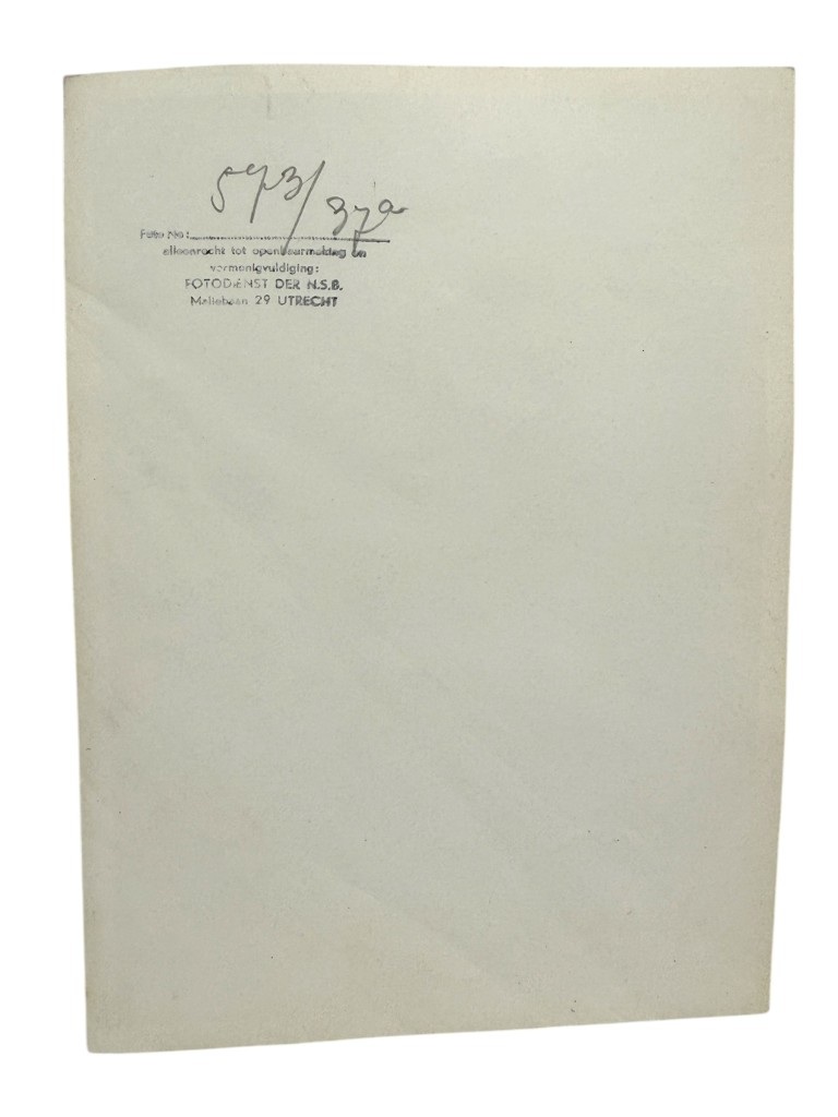 In this Dutch NSB photograph (dimensions 18 x 13 cm), NSB leader Anton Mussert is seen visiting a gathering of the Nationale Jeugdstorm (NJS), the youth organization of the National Socialist Movement in the Netherlands. Mussert, accompanied by party officials in uniform, walks past a row of Jeugdstorm members in uniform giving the national salute.
