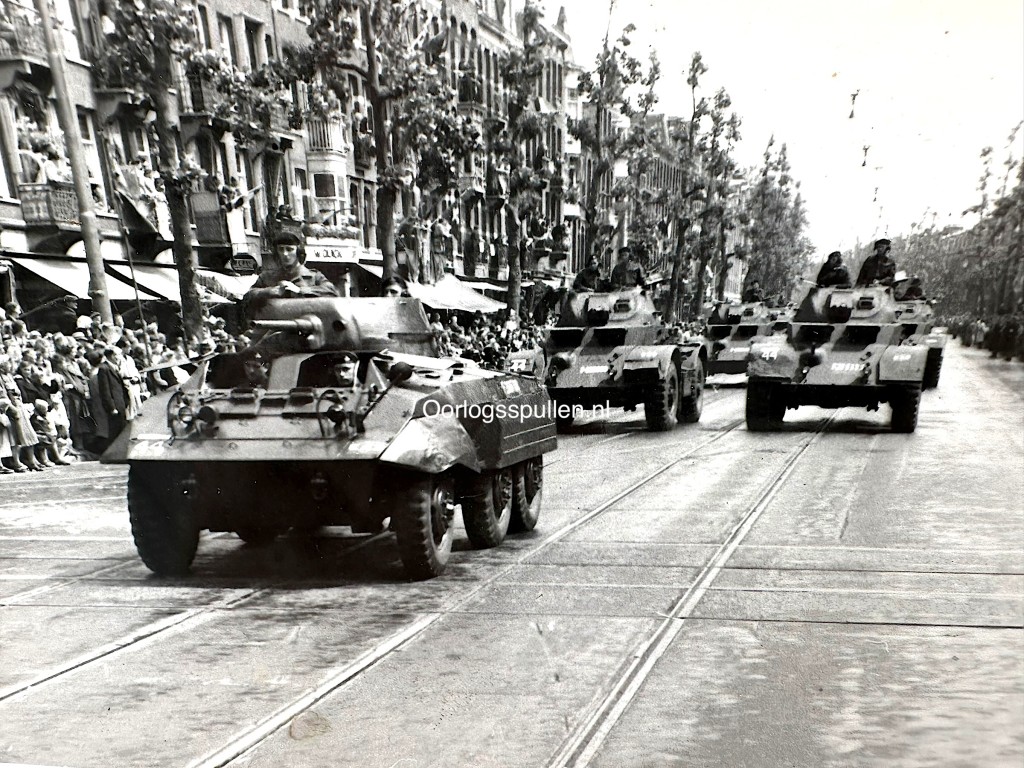 Originele Nederlandse bevrijdingsfoto uit 1945 waarop geallieerde pantservoertuigen door Amsterdam rijden tijdens de bevrijdingsdagen.