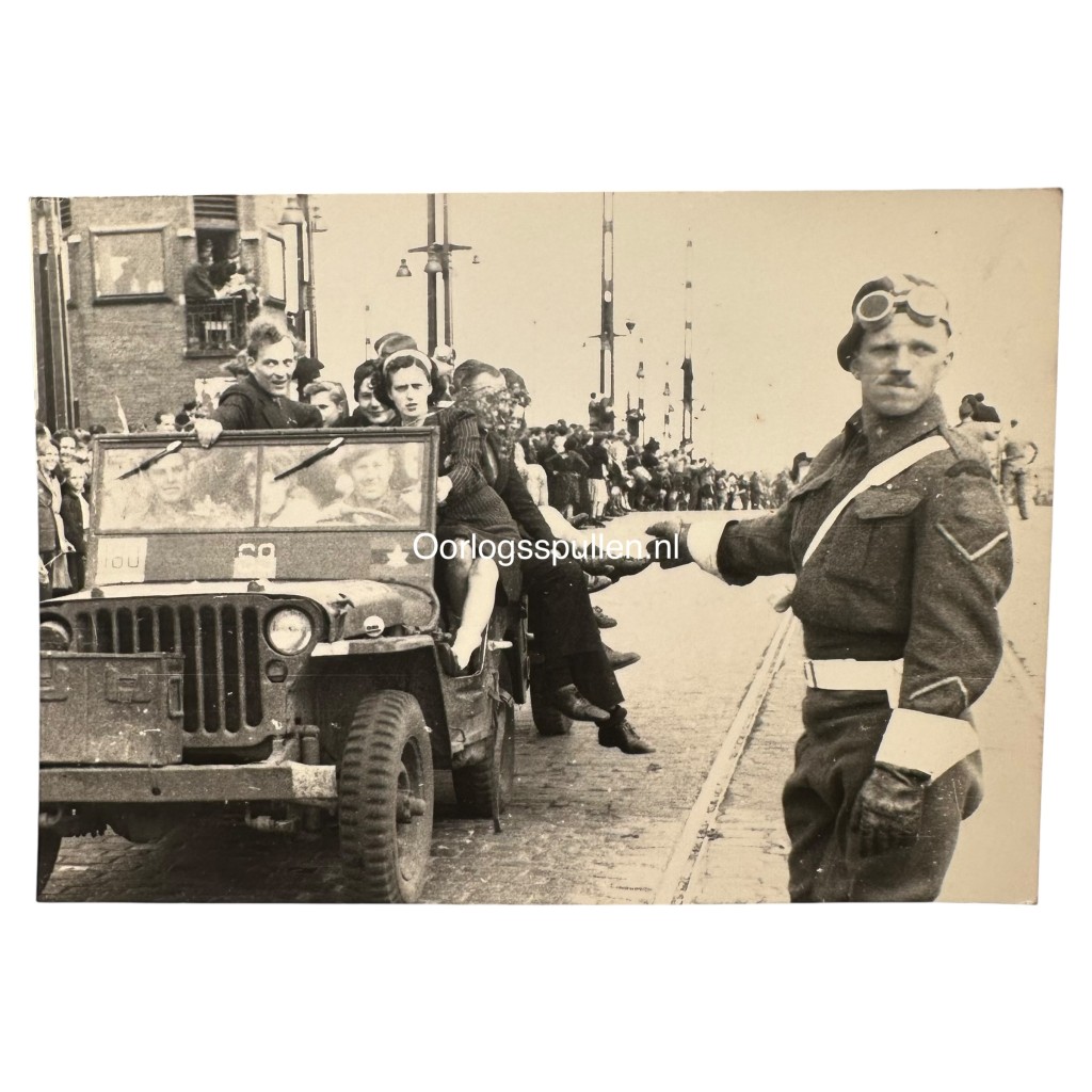 Originele WWII Nederlandse bevrijdingsfoto Berlagebrug Amsterdam – Burgers op Geallieerde jeep
