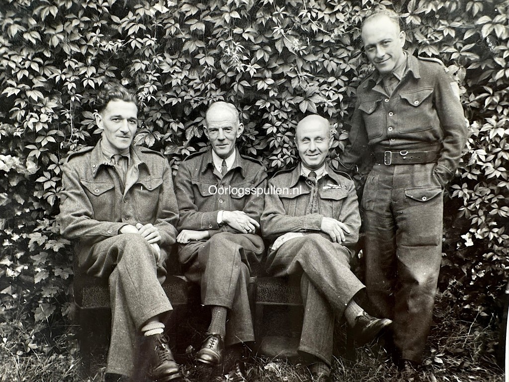 The black and white photo shows four uniformed men seated and standing in front of dense foliage, likely taken shortly after the liberation of the Netherlands.