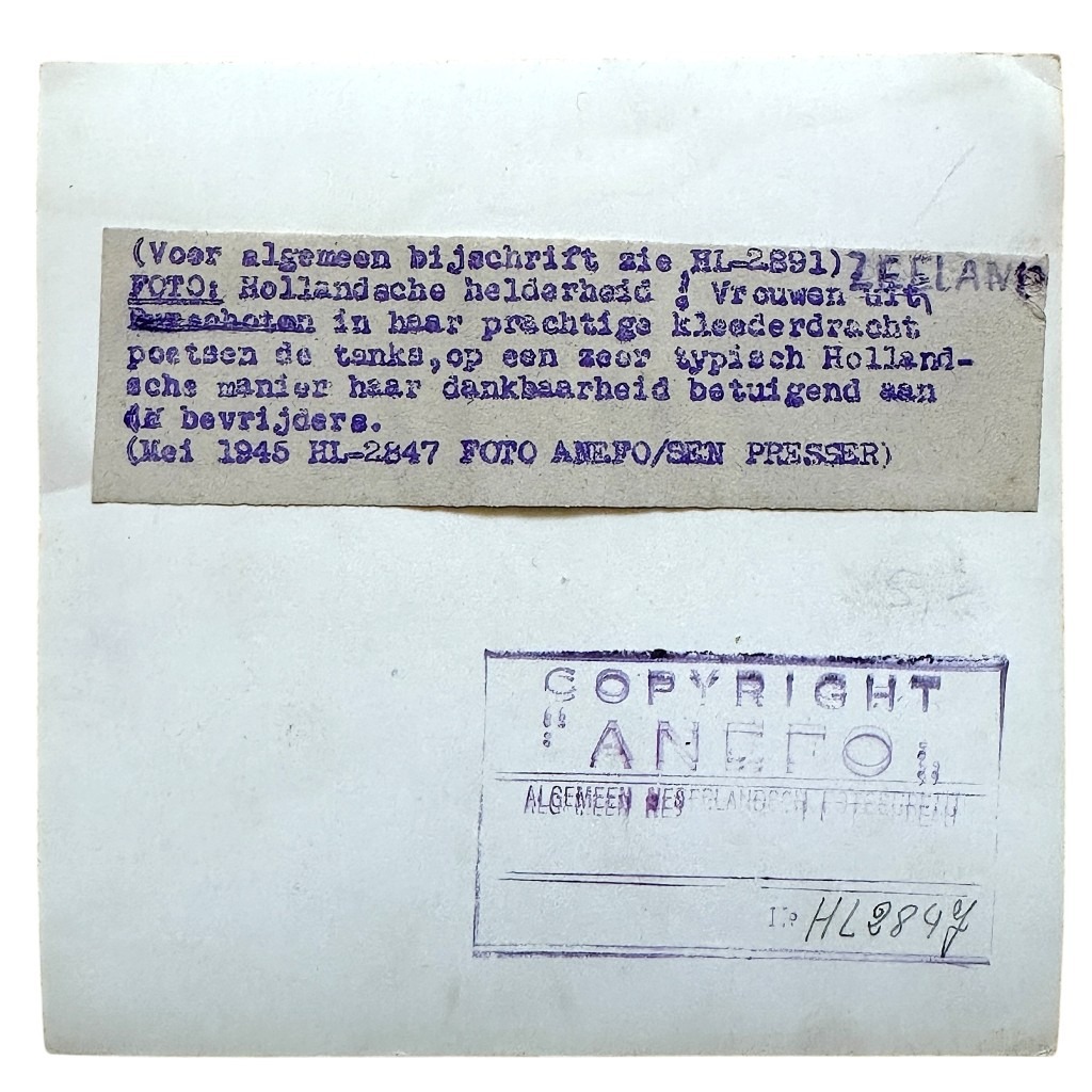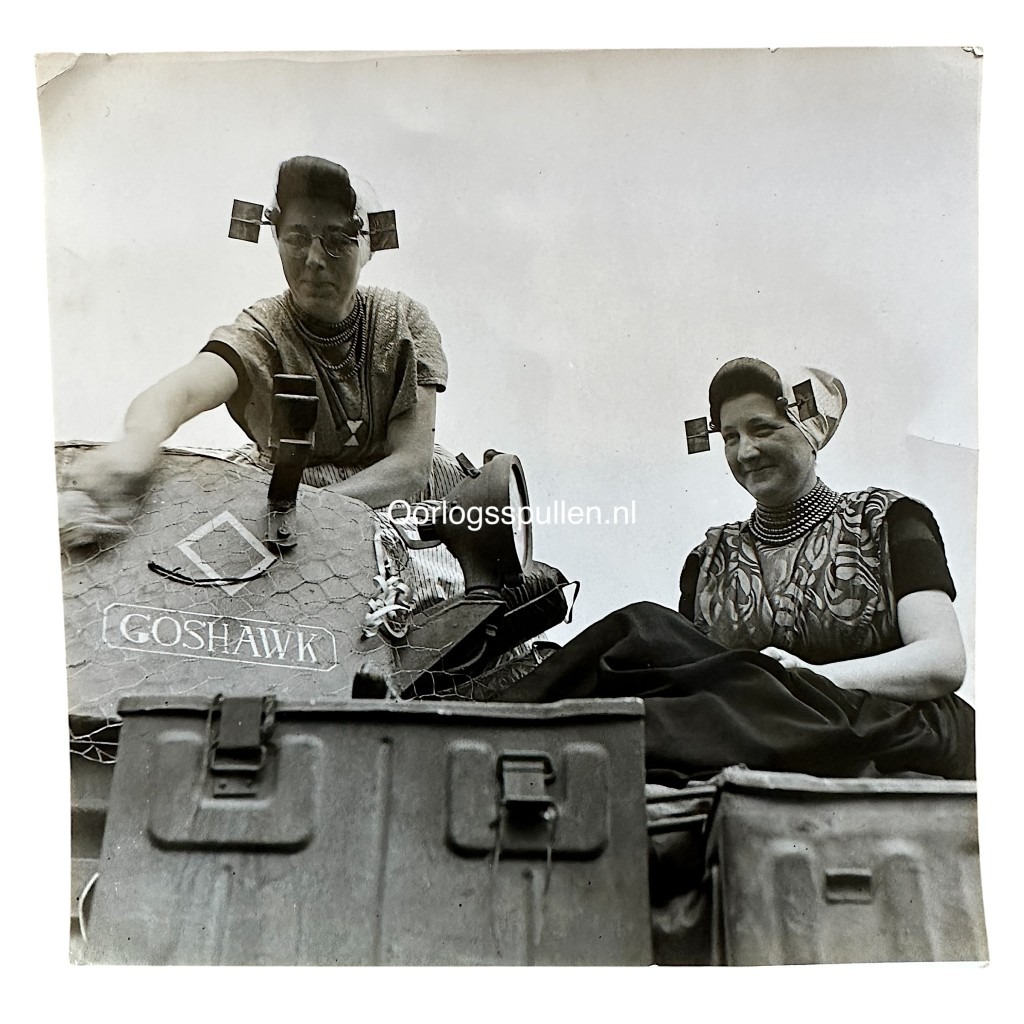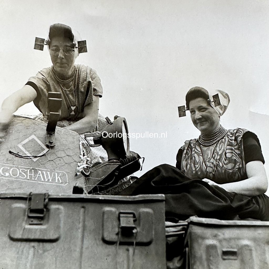 This Dutch photograph is in good condition, dates from May 1945 and shows two Dutch women on an Allied vehicle during the liberation of the Netherlands.