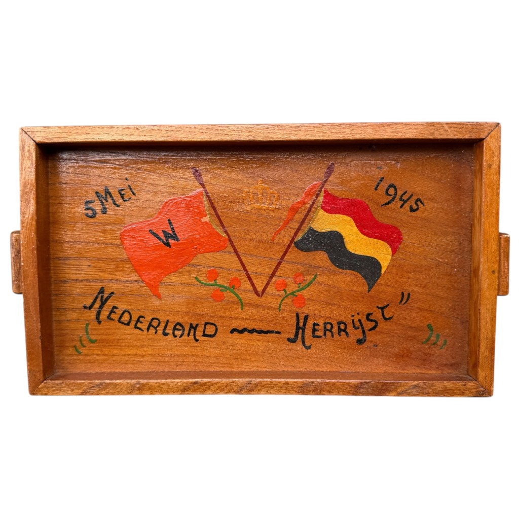 The tray features hand-painted flags and the text “5 May 1945 Netherlands Rises Again”.