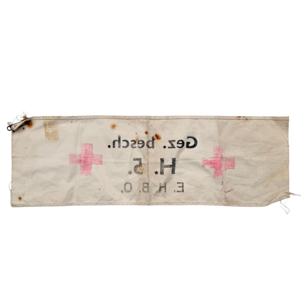 Gezinsbescherming courses were given in 1939 by the Dutch Association for Air Protection to prepare civilians for first-aid duties during air raids. The sturdy, cream-coloured cloth with red crosses and black lettering “Gez. besch. H.5. E.H.B.O.” is in used condition.