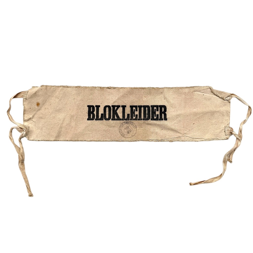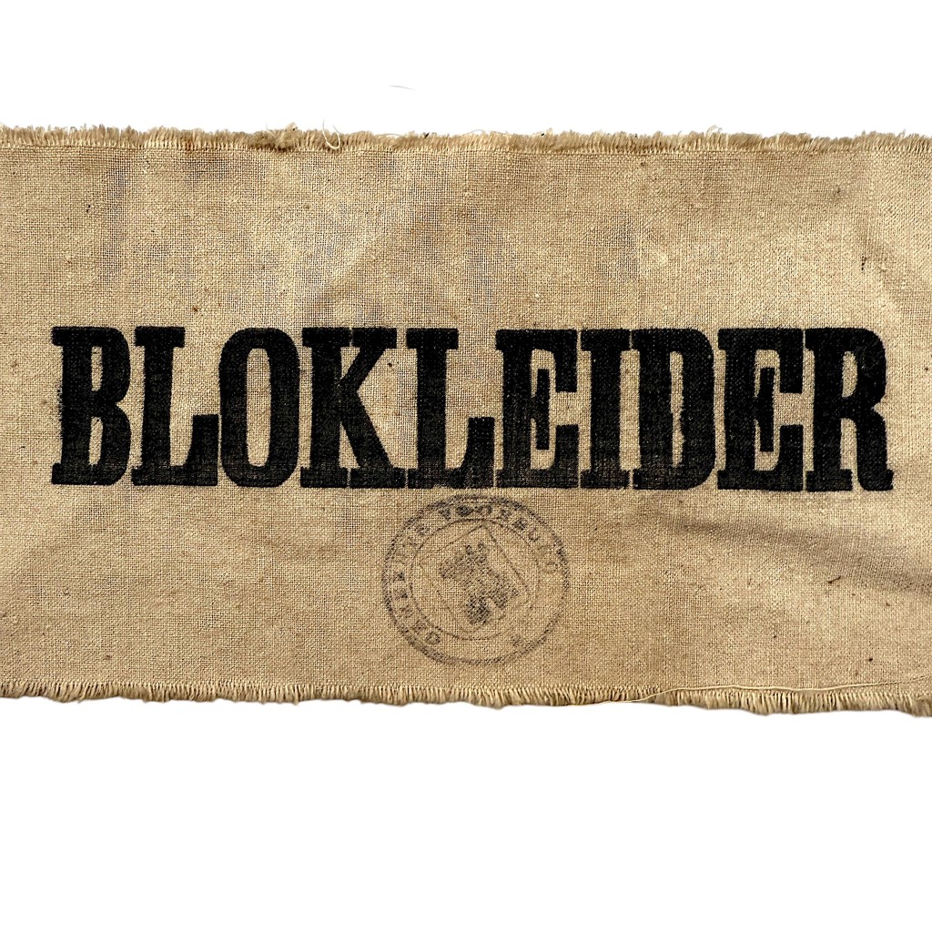 The armband is made of unbleached cotton and clearly printed with the word “BLOKLEIDER”, complemented by a well-visible stamp from the Municipality of Voorburg.