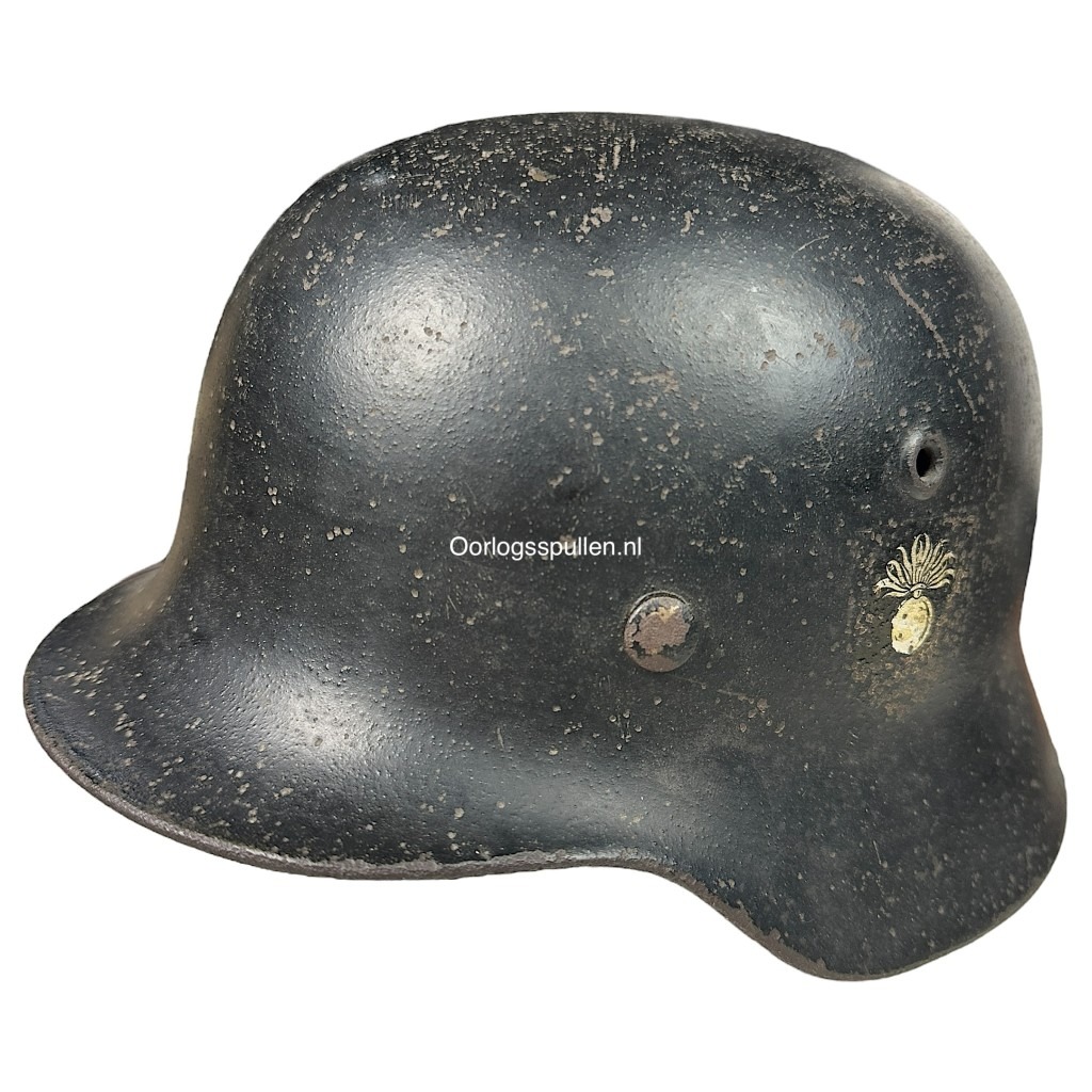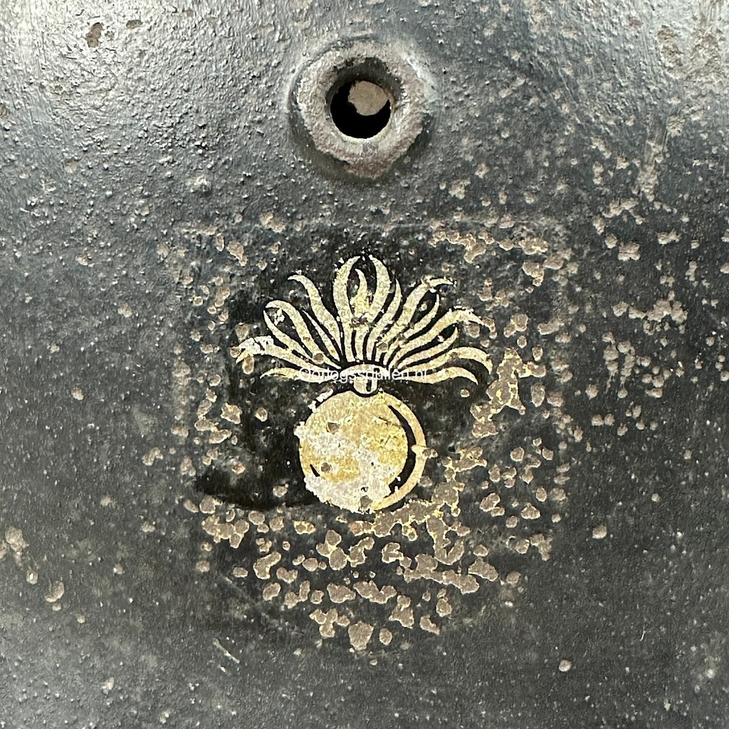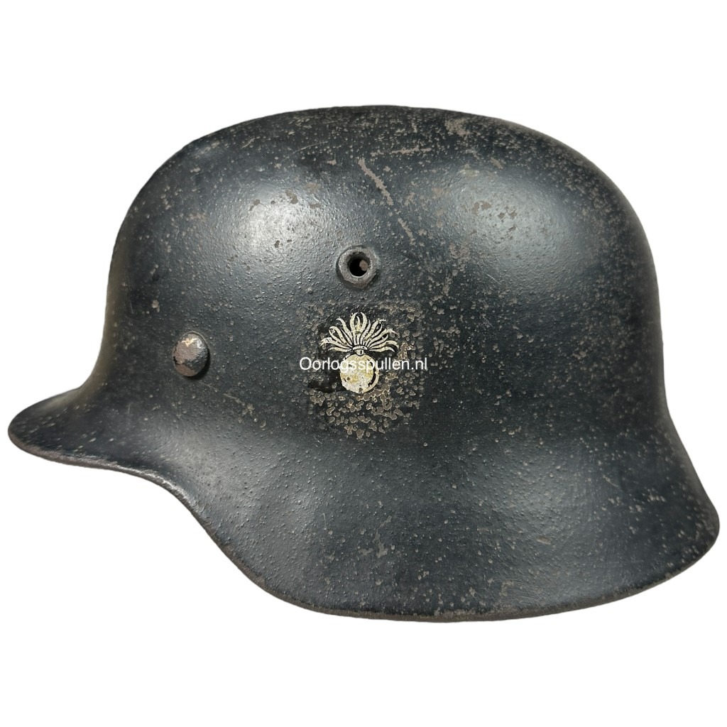 The helmet is originally a German M35 helmet which was periodically darkened and fitted with the two decals, the lion and the grenade.