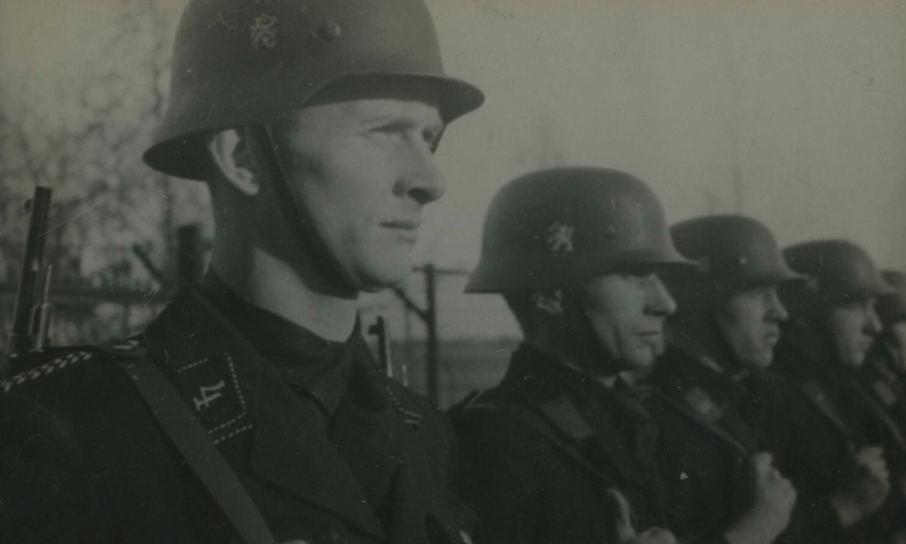 It is known that this type of helmet was worn by members of the Schalkhaar Police and Landwacht Nederland during World War II.