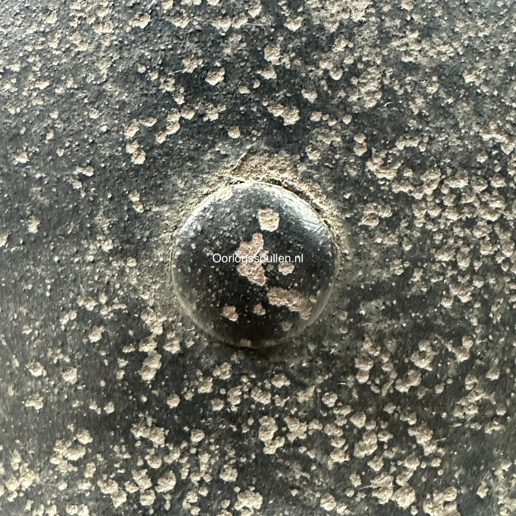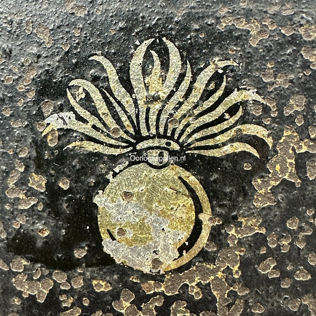 De helm is van origine een Duitse M35 helm welke periodiek donker gemaakt is en voorzien werd van de twee decals, de leeuw en de granaat.