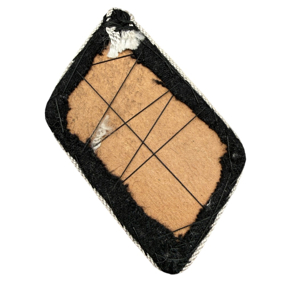 De achterzijde toont de oorspronkelijke constructie met versteviging en handmatig aangebrachte bevestigingsdraden, zoals kenmerkend voor Nederlandse uniforminsignes uit deze periode.