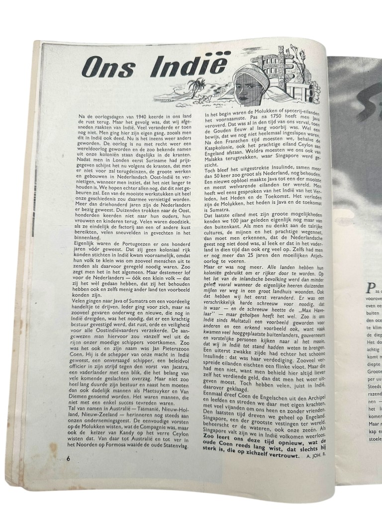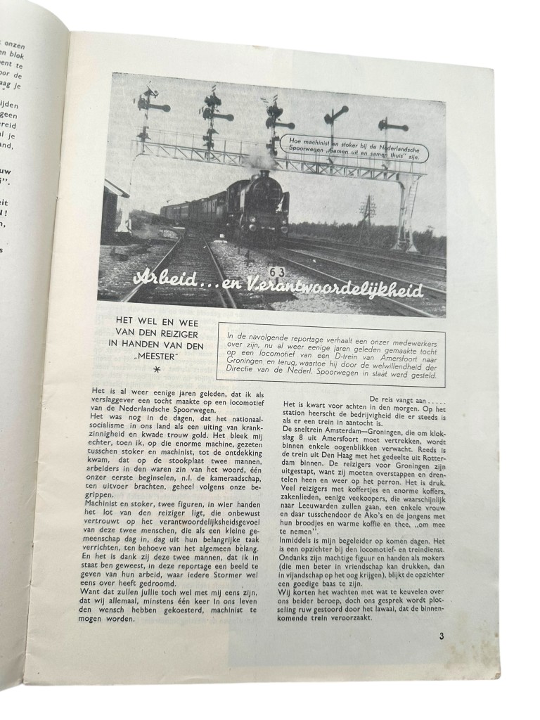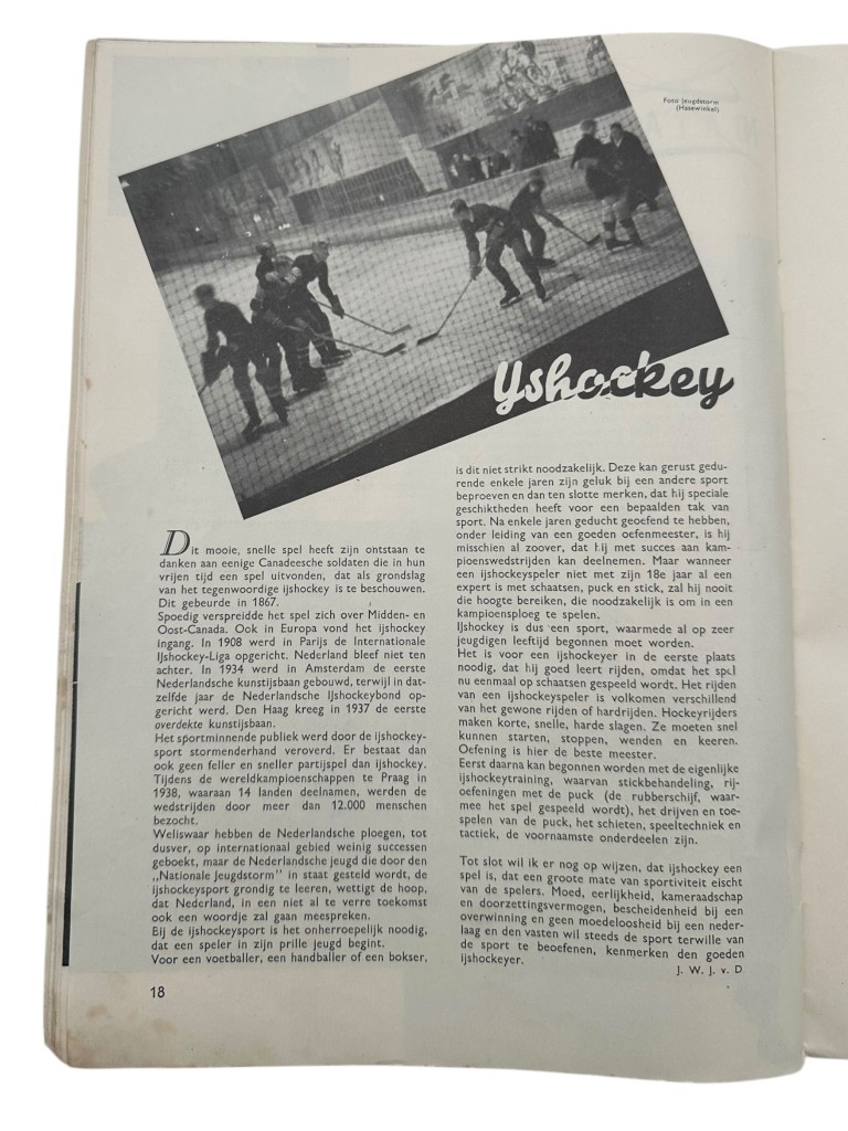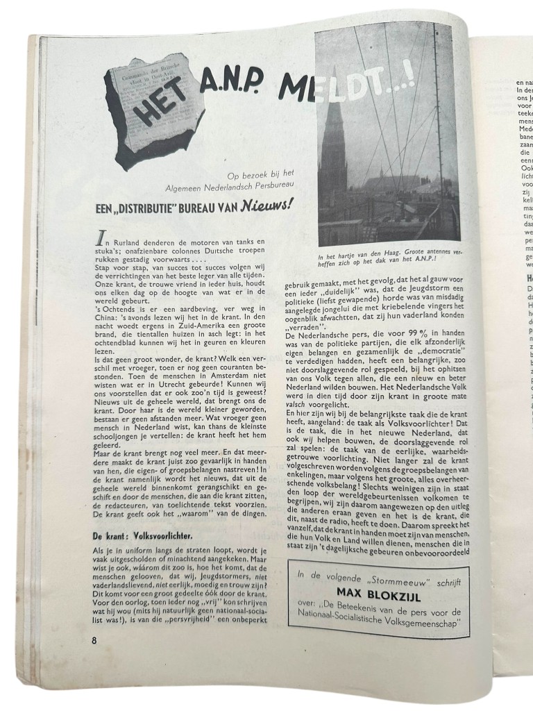 Dit exemplaar van De Stormmeeuw (8e jaargang, nr. 1, Louwmaand 1942) is een originele uitgave van het maandblad van de Nationale Jeugdstorm, de jeugdorganisatie van de NSB tijdens de bezettingsjaren. Het nummer bevat artikelen, reportages en propagandistische bijdragen over luchtvaart, militair nieuws, jeugdactiviteiten en culturele onderwerpen, aangevuld met typisch beeldmateriaal dat de ideologische en fysieke vorming van jongeren moest stimuleren. Een interessant historisch blad dat inzicht biedt in de functie, boodschap en werking van de NJS in oorlogstijd, geschikt voor verzamelaars en onderzoekers van collaboratie- en jeugdorganisaties uit de Tweede Wereldoorlog.