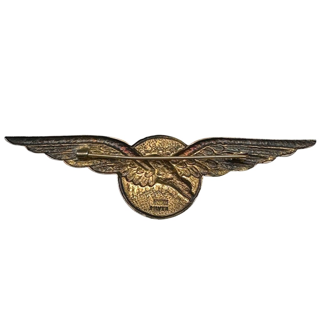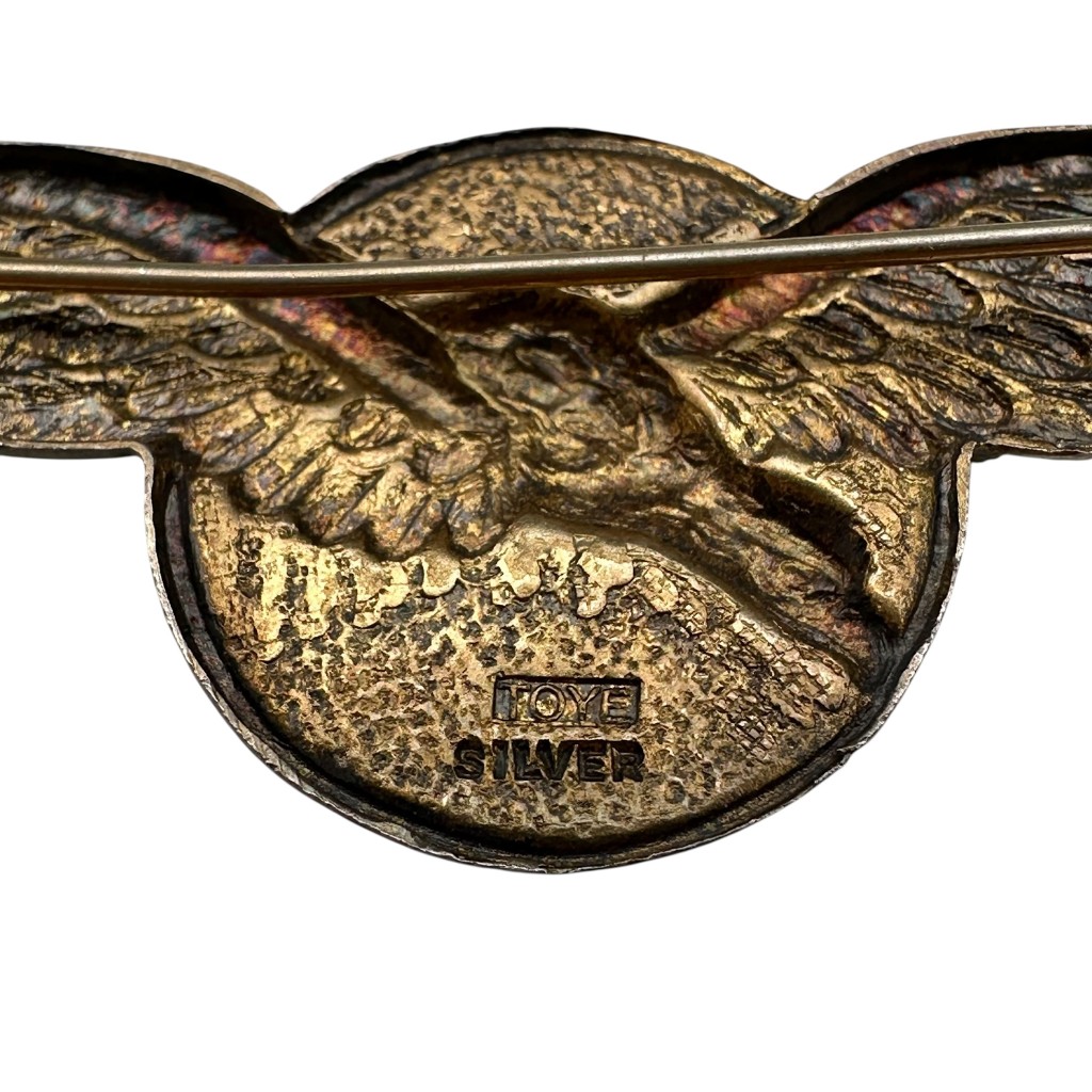 Het stuk toont een sierlijke adelaar met volledig gespreide vleugels voor een diep oranje geëmailleerde zon. Aan de achterzijde staat de stempel “Toye Silver”, afkomstig van de gerenommeerde Britse maker Toye & Co., bekend om zijn hoogwaardige zilveren en verzilverde militaire insignes uit de oorlogsjaren. De wing is compleet met functionele speld aan de achterzijde.
