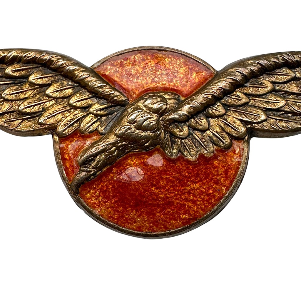 The piece features a graceful eagle with fully spread wings set against a deep orange enamelled sun.