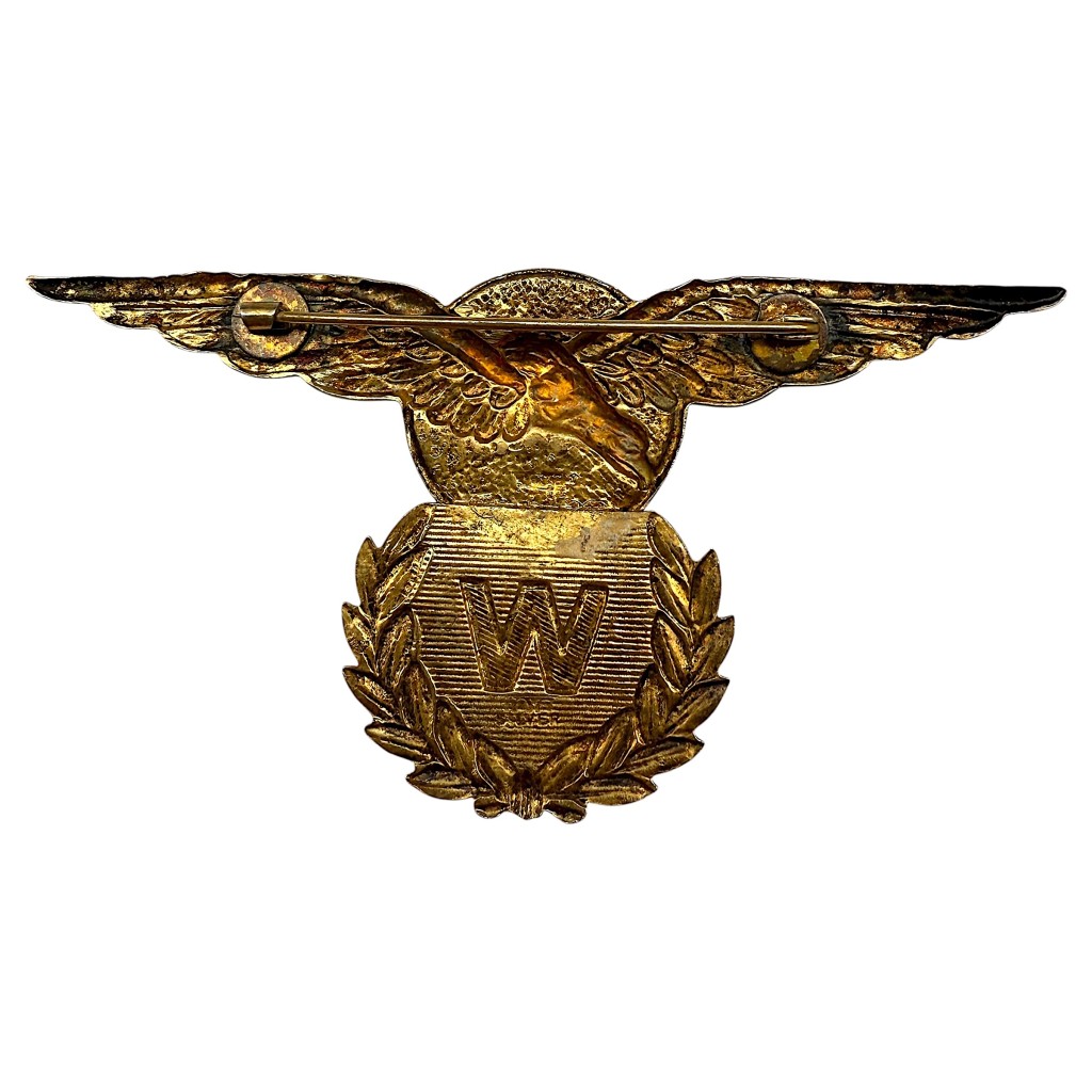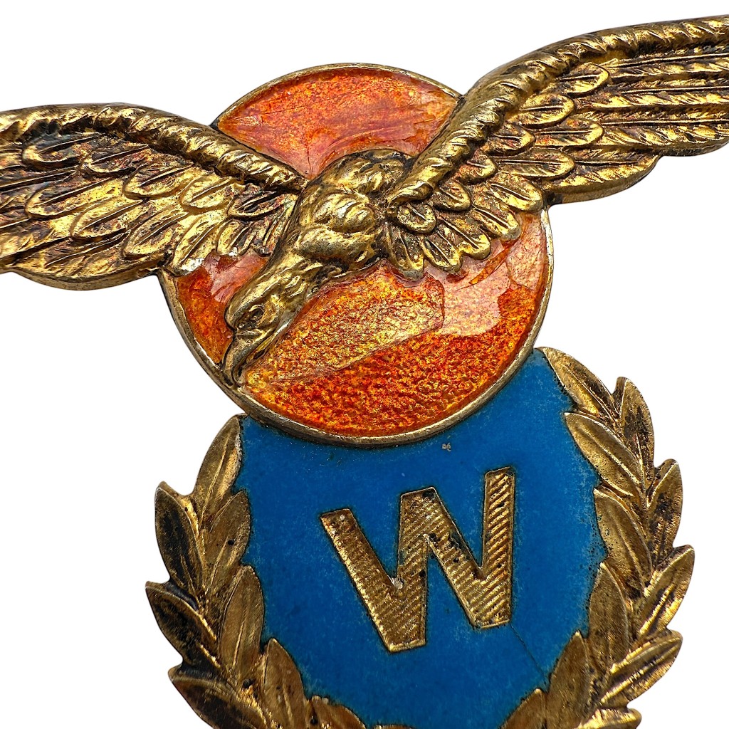 The wing is made of gold-coloured metal and features an elegantly spread pair of wings set against an orange enamelled sun, combined with a blue shield bearing the gold letter W, framed by a finely detailed laurel wreath.