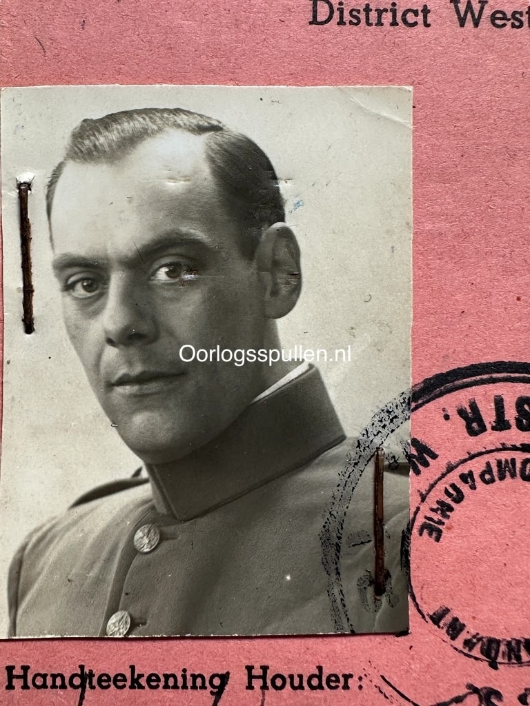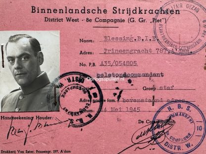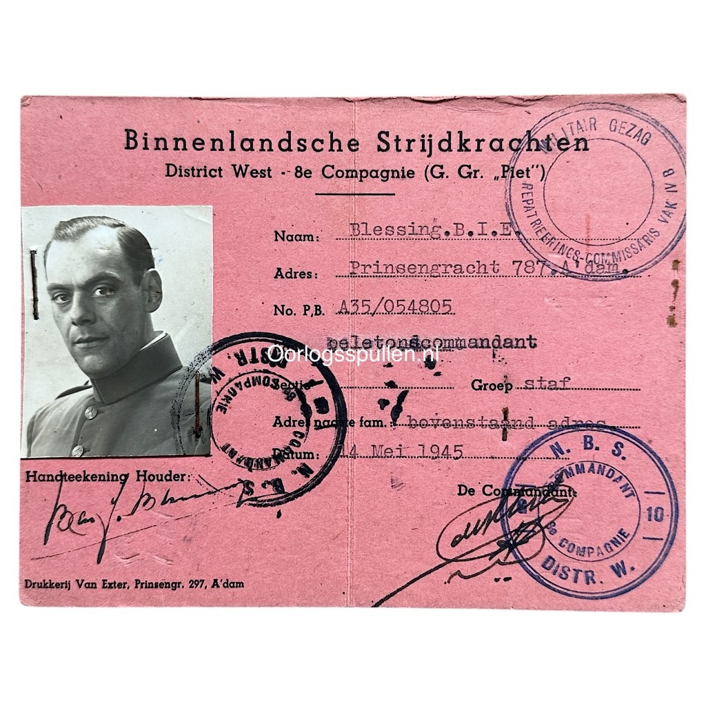 This Dutch Domestic Forces (Nederlandse Binnenlandse Strijdkrachten) ID card is in good condition, dates from May 1945 and was used by the NBS platoon commander in Amsterdam.