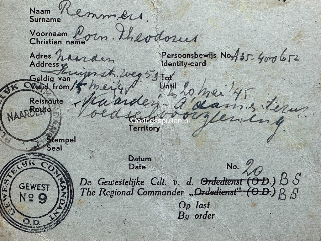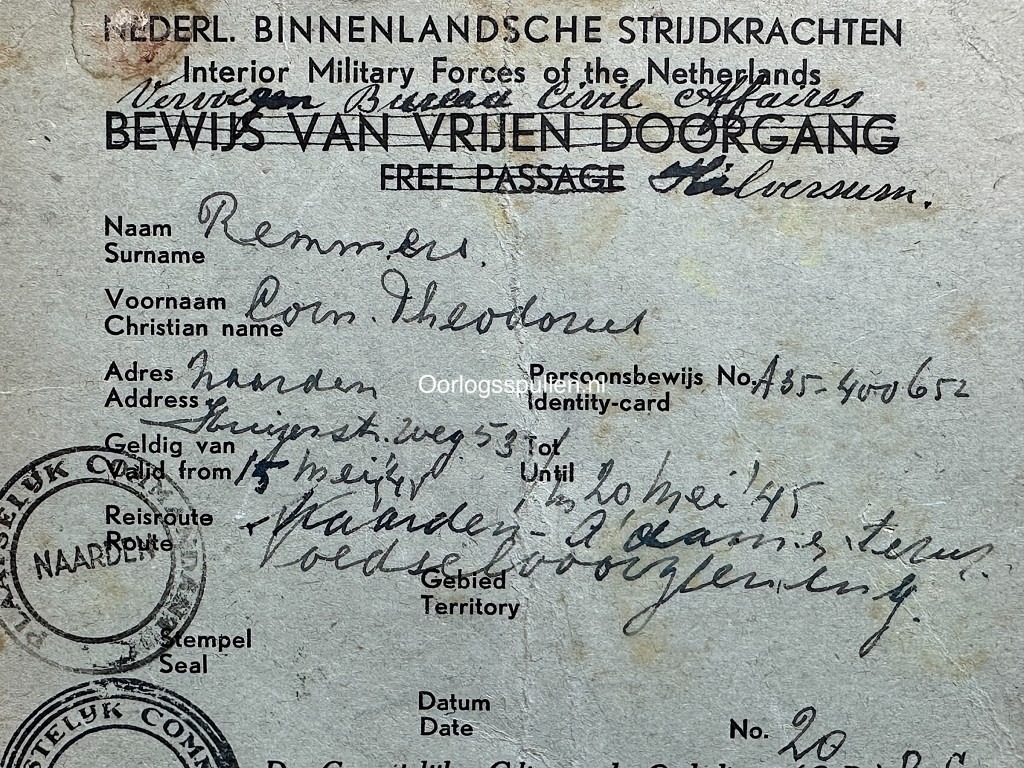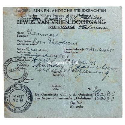 This Dutch Domestic Forces (Nederlandse Binnenlandse Strijdkrachten) transit card is in used condition, dates from May 1945, and was used in Hilversum by a resident of Naarden who was involved in food supply during the liberation period.
