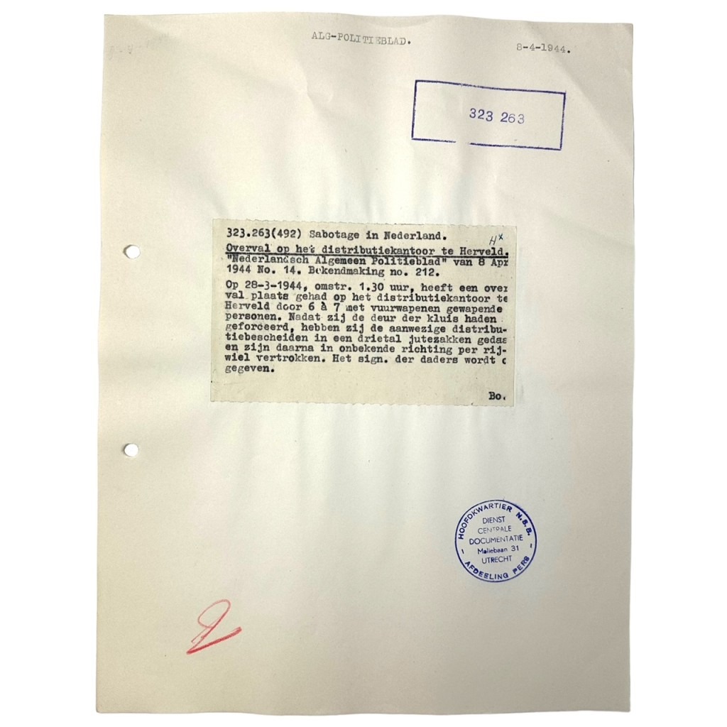 On July 20, 1944, four armed persons raided the distribution office in Herveld, municipality of Valburg. From the three police officers present the pistols were taken away and a large quantity of distribution documents was stolen.’