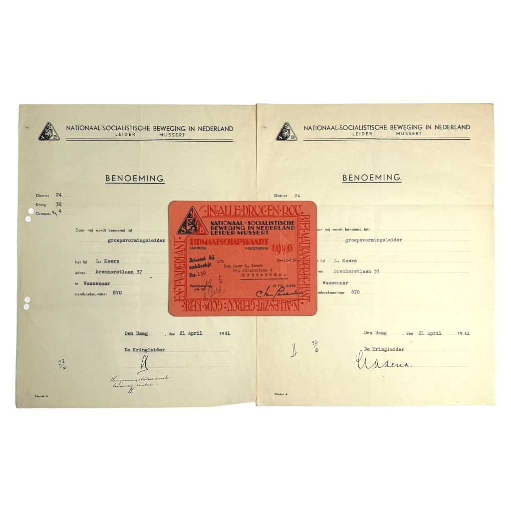 The set consists of his 1940 membership card and two promotion documents from NSB leader Anton Mussert stating that he became Group Formation Leader on April 21, 1941, the official promotion documents from Anton Mussert for Districtsleader of Rotterdam, Kring leader, Temporary Kringsleader.