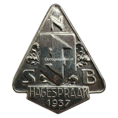 Deze Nederlandse NSB speld is in goede conditie, voorzien van het Wolfsangel symbool en werkt uitgereikt vanwege de NSB Hagespraak die gehouden werd op de Goudsberg te Lunteren.