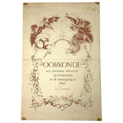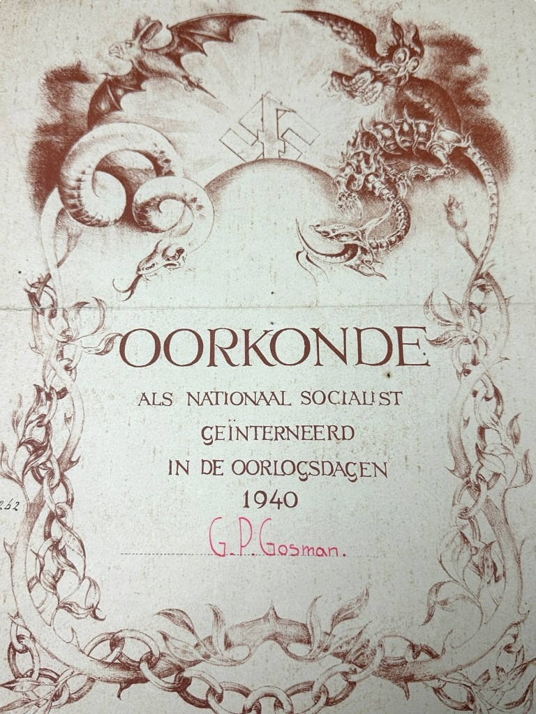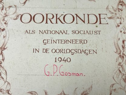 Het NSB lid werd in mei 1940 geïnterneerd en daarvoor ontving hij deze decoratie oorkonde.