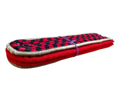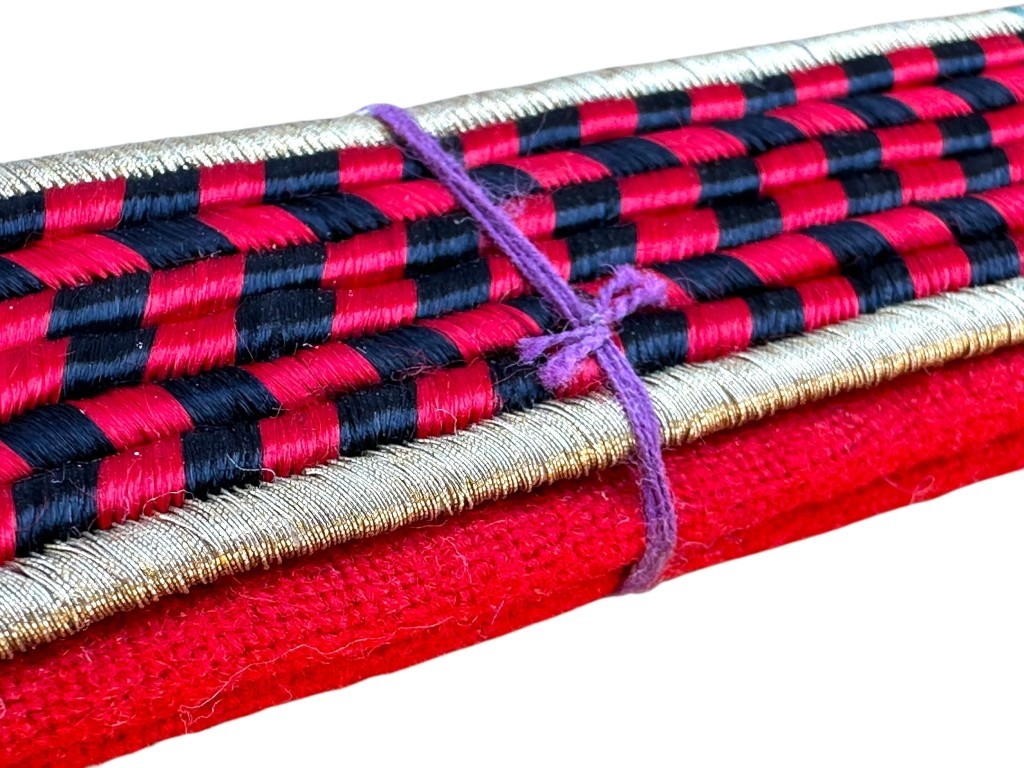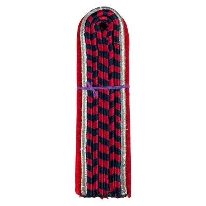 The shoulder pieces are produced with red wool and gold thread and still attached to each other.