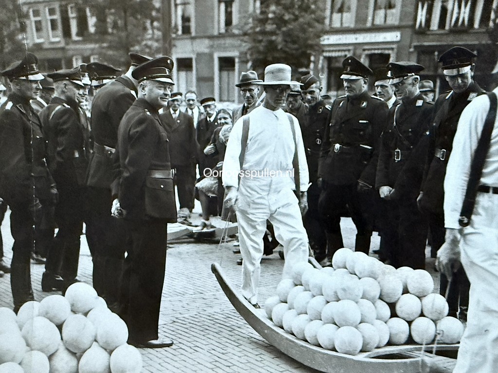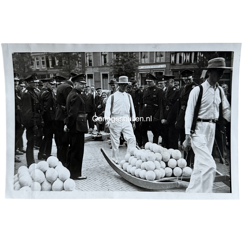 Originele zwart-witfoto uit de Tweede Wereldoorlog waarop NSB-leider Anton Mussert te zien is tijdens een bezoek aan de kaasmarkt in Alkmaar, juni 1942. De foto toont Mussert te midden van NSB’ers, terwijl hij langs de karakteristieke stapels kazen loopt die Alkmaar internationaal bekend maakten. Het scherpe contrast tussen het traditionele Nederlandse marktleven en de zichtbare aanwezigheid van de Nationaal-Socialistische Beweging maakt deze opname bijzonder indringend. Deze foto is een historisch verzamelobject dat een helder beeld geeft van collaboratie, propaganda en de invloed van de NSB tijdens de Duitse bezetting van Nederland.