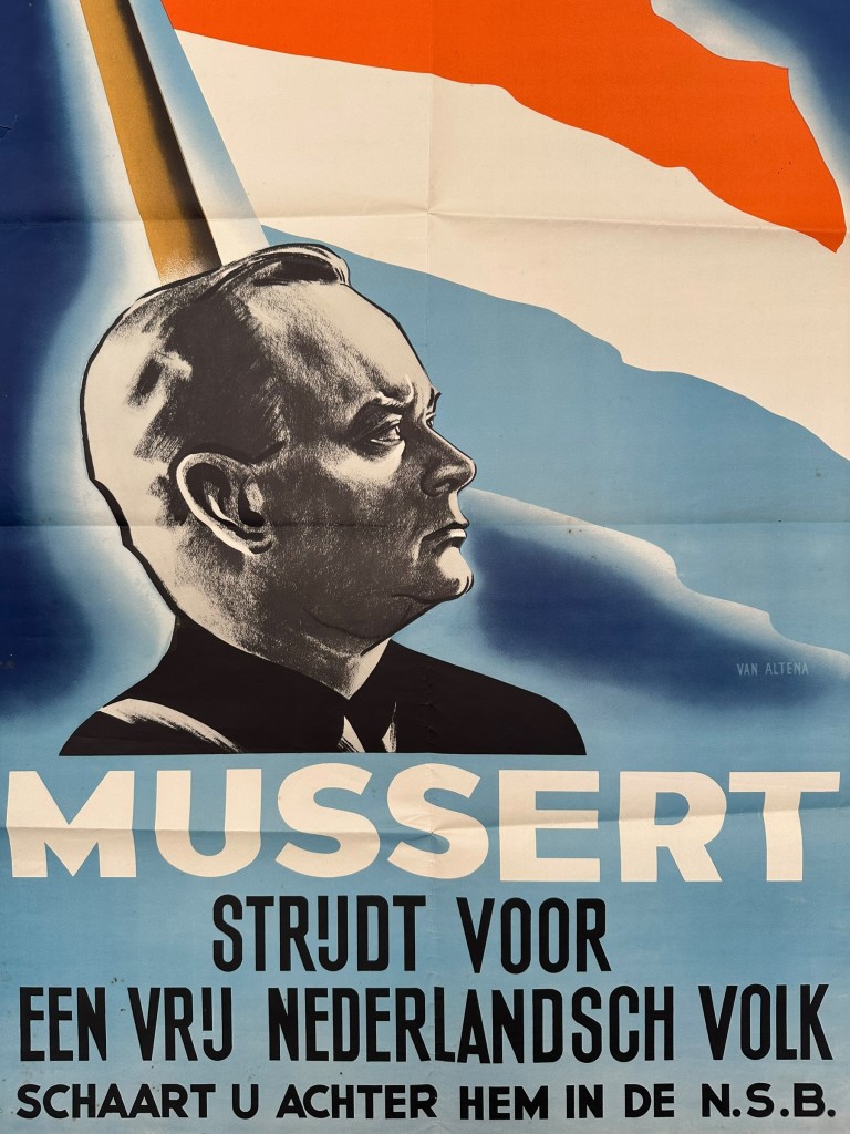 The text “Mussert strijdt voor een vrij Nederlandsch volk schaart u achter hem in de N.S.B.” highlights the political message of the era.