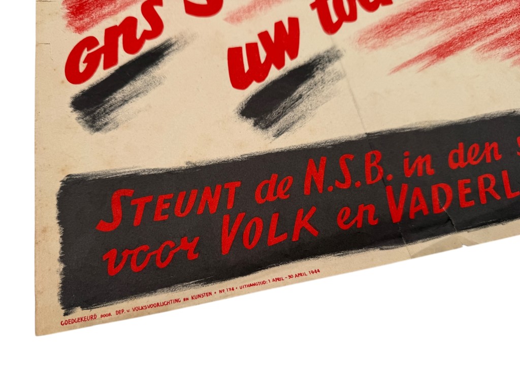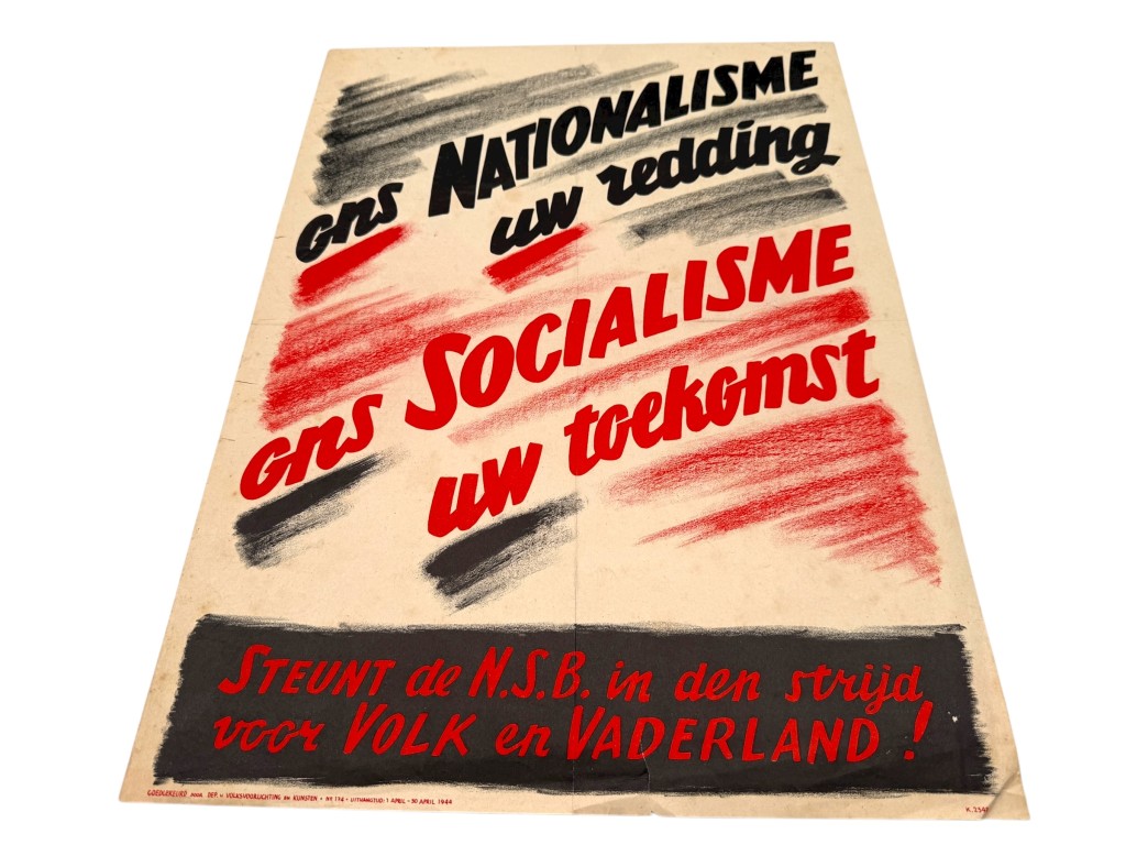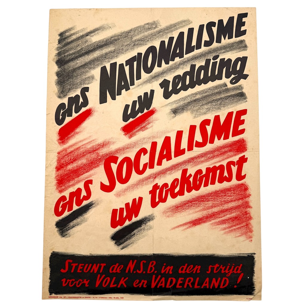 Deze collaboratieposter van de Nationaal-Socialistische Beweging (NSB) uit 1944 is een opvallend propagandadrukwerk uit de bezettingstijd. Het ontwerp is uitgevoerd in expressieve rode en zwarte krijtstrepen, waarmee de slogans “ons Nationalisme – uw redding” en “ons Socialisme – uw toekomst” extra nadruk krijgen. Onderaan volgt de oproep “Steunt de N.S.B. in den strijd voor Volk en Vaderland!”, zoals goedgekeurd door het Departement van Volksvoorlichting en Kunsten. De poster is gedrukt in een dynamische, haast geschilderde stijl die bedoeld was om emotie op te wekken en de politieke boodschap direct en krachtig over te brengen.