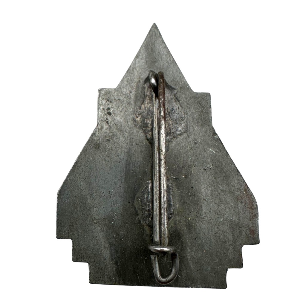 Het insigne is vervaardigd uit metaal met reliëfdetails en heeft aan de achterzijde een originele verticale speldsluiting.