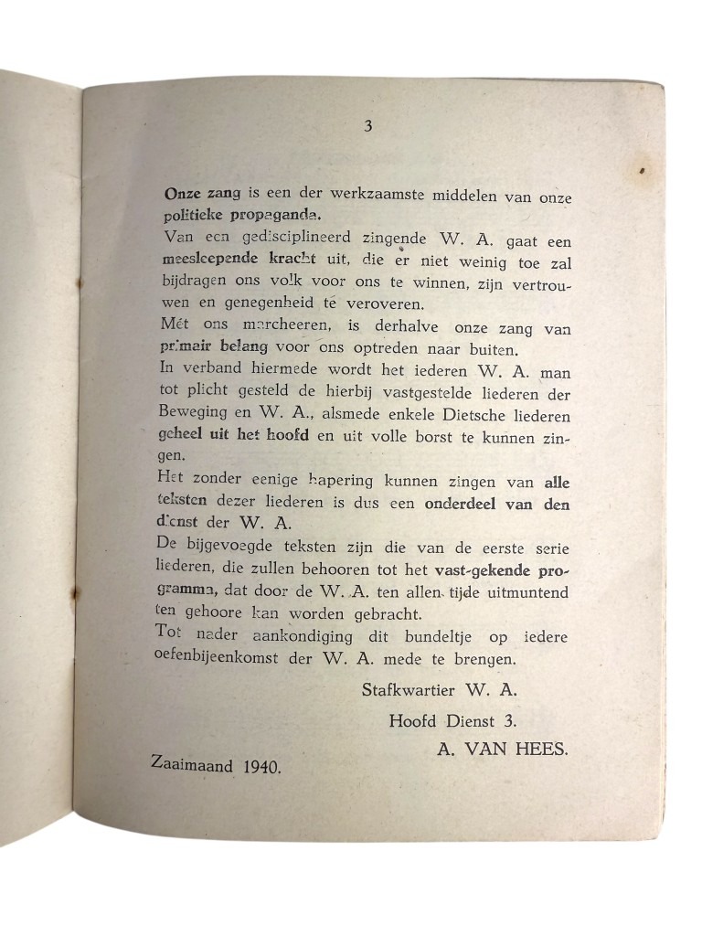 This Dutch NSB W.A. song booklet (No. 2) from World War II was issued in 1940 and contains propaganda songs of the Weerafdeling (W.A.), the paramilitary branch of the National Socialist Movement.