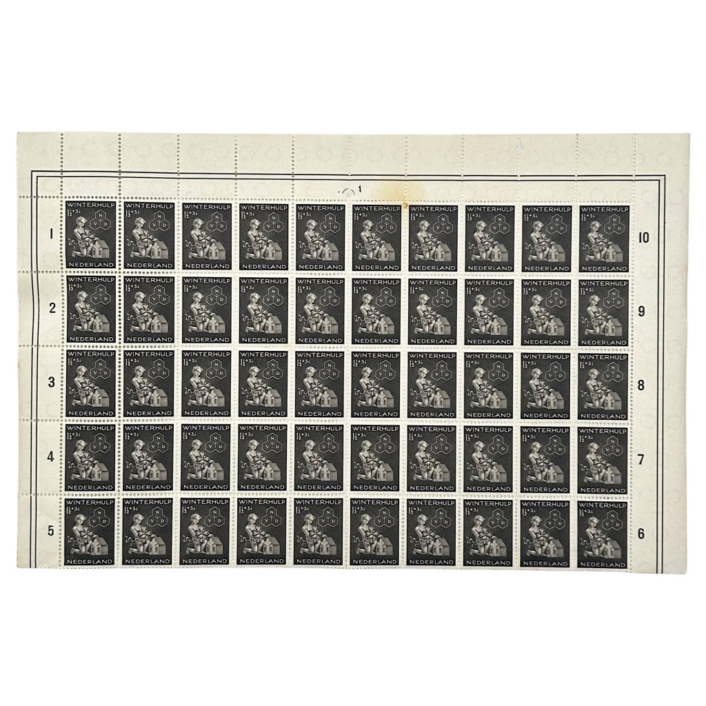 Origineel vel Nederlandse Winterhulp / Nederlandsche Volksdienst (NVD) toeslagzegels uit de Tweede Wereldoorlog, bestaande uit 50 zegels (5 rijen van 10). De zegels dragen het opschrift “WINTERHULP” en “NEDERLAND” met waardeaanduiding 12½ + 3, waarbij de toeslag bestemd was voor de Winterhulp-organisatie tijdens de bezettingsjaren 1940–1945. Het ontwerp toont een gestileerde voorstelling met kind en symboliek van de Nederlandsche Volksdienst (NVD). Een historisch en filatelistisch interessant object voor verzamelaars van Nederlandse bezettingsuitgaven, Tweede Wereldoorlog postgeschiedenis en propaganda-gerelateerde postzegels.