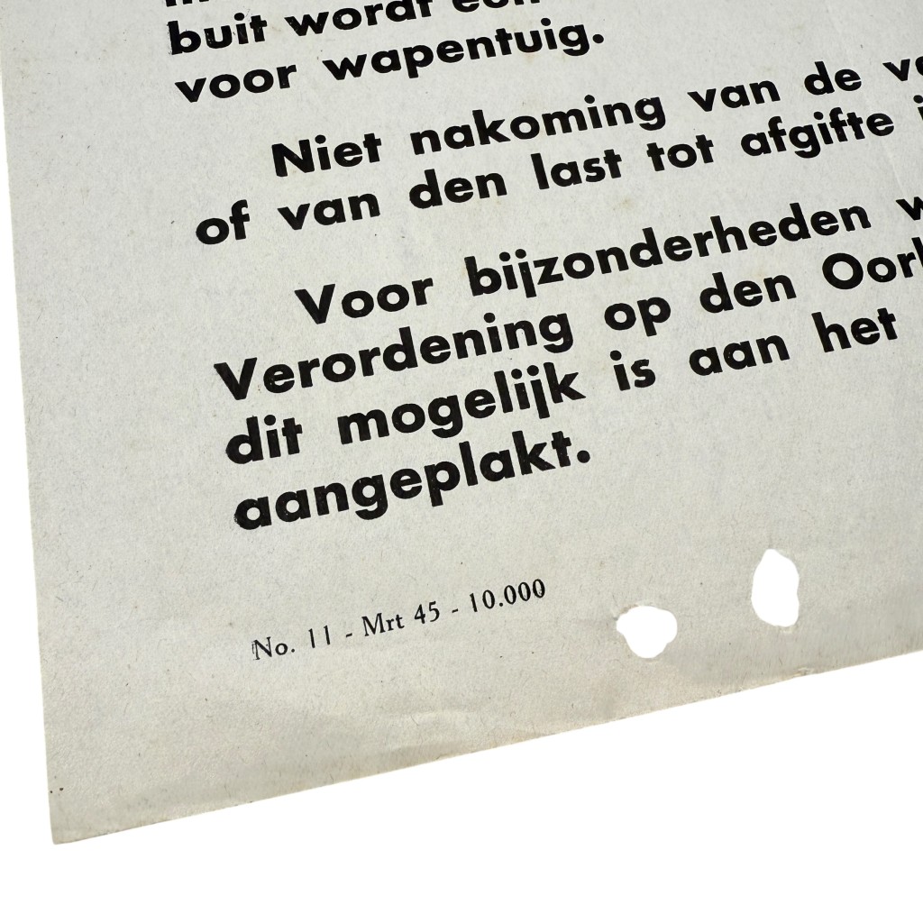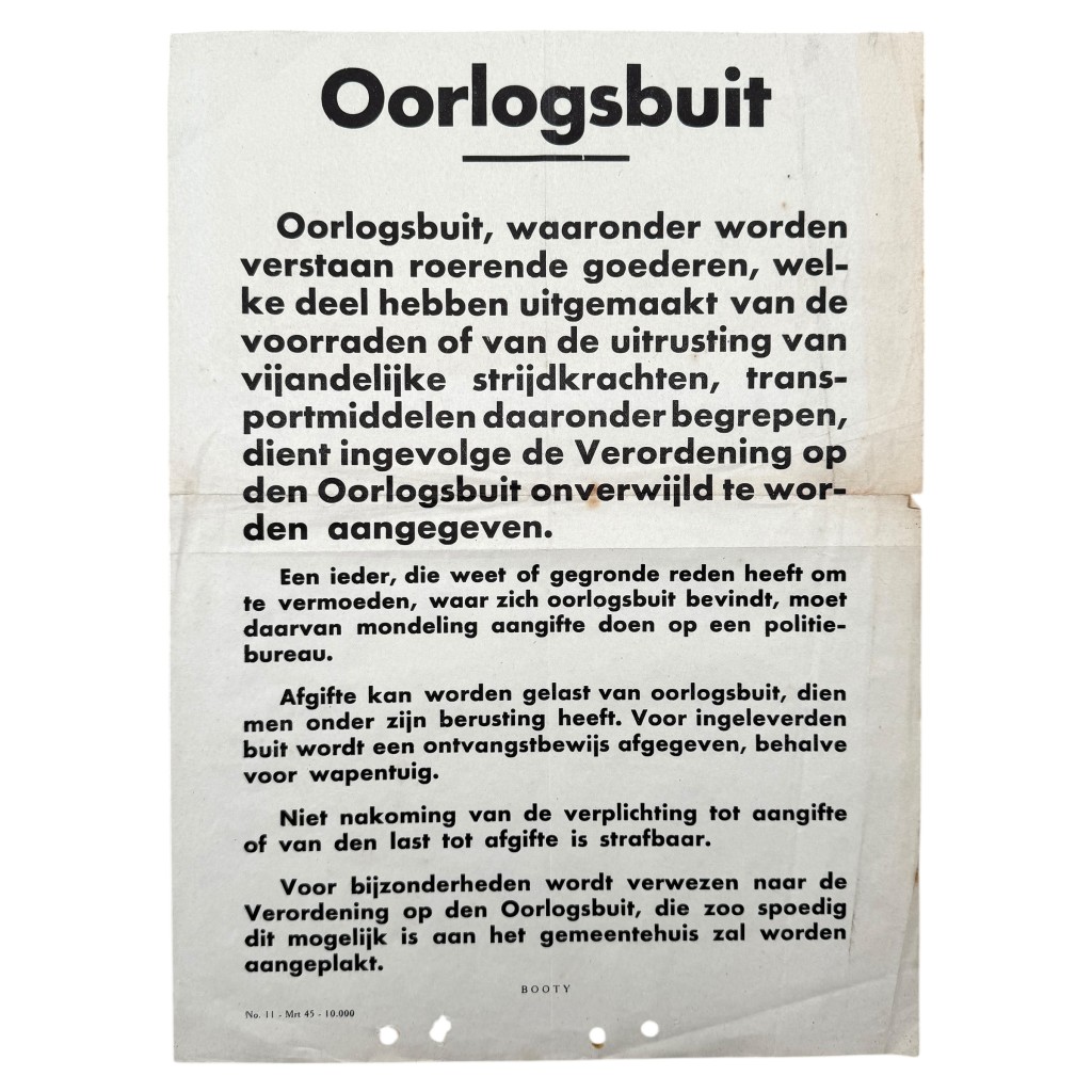 Deze Nederlandse poster uit maart 1945, getiteld “Oorlogsbuit”, werd uitgegeven in de laatste maanden van de Tweede Wereldoorlog. De kennisgeving verplicht burgers tot het melden en afgeven van oorlogsbuit, waaronder goederen of uitrusting afkomstig van vijandelijke strijdkrachten, zoals wapens, voertuigen of andere militaire voorraden. De tekst vermeldt dat het niet naleven van deze meldplicht strafbaar is, en dat inbeslag genomen goederen enkel met een ontvangstbewijs mochten worden overgedragen.