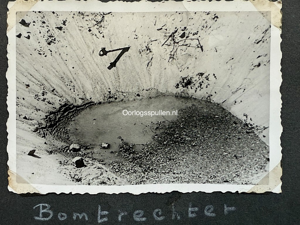 The photograph shows a bomb crater on Vijverhofstraat in Rotterdam.