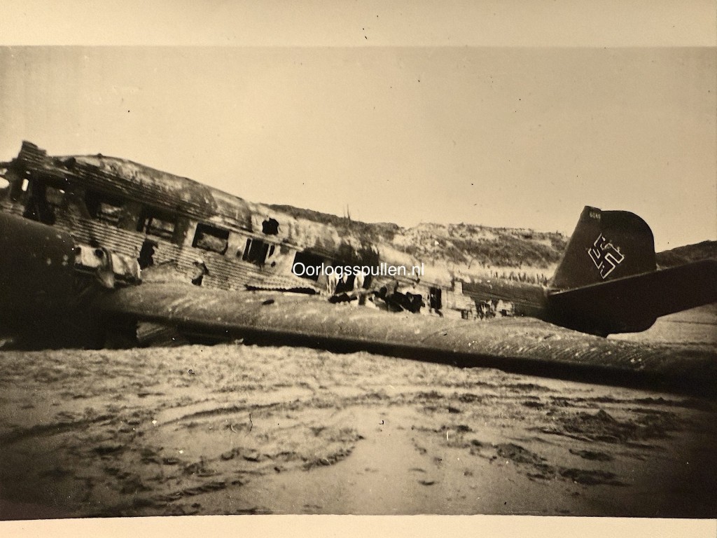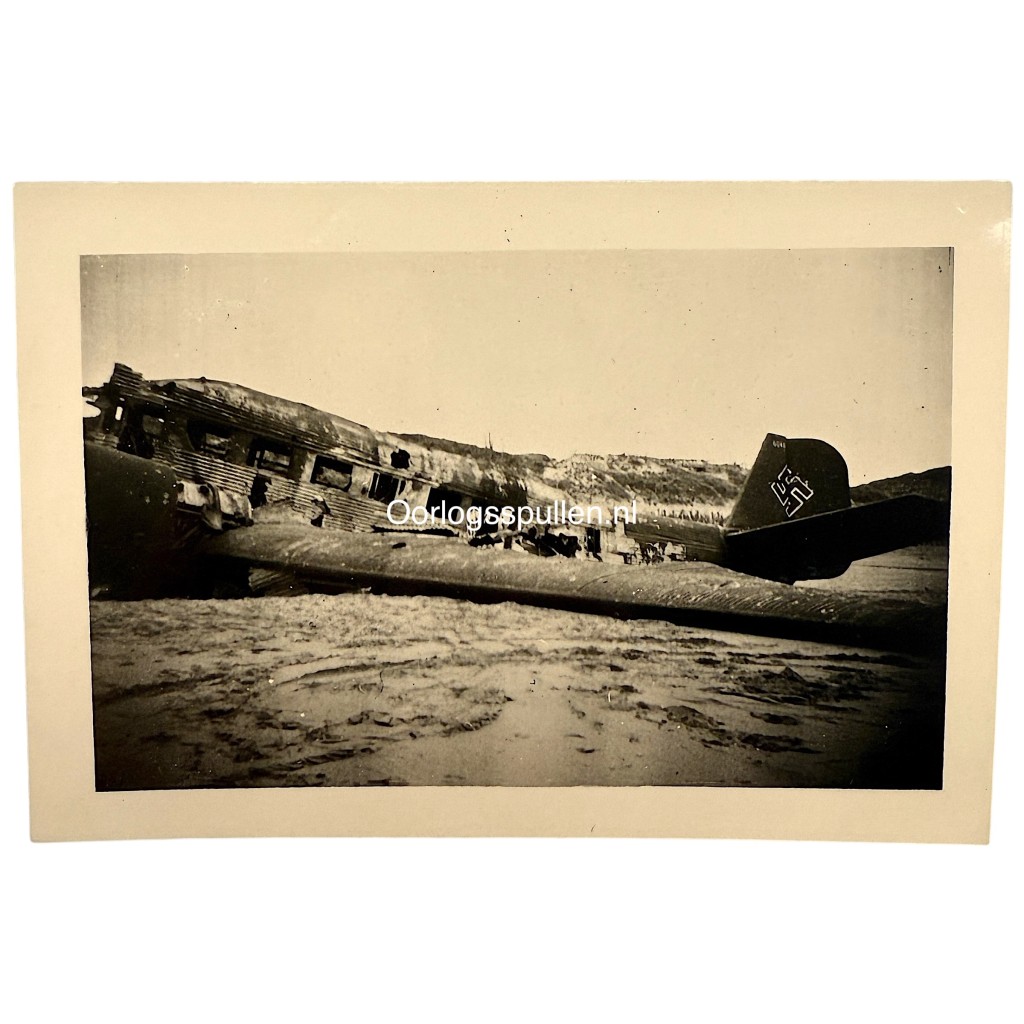 Originele Nederlandse foto uit de Tweede Wereldoorlog waarop het wrak van een neergestort Duits Junkers JU 52-transportvliegtuig op het strand bij Kijkduin/Ter Heijde is te zien.