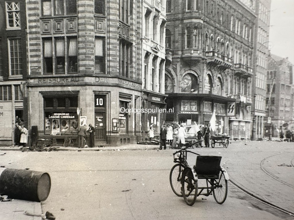 Originele WWII Nederlandse foto van schietpartij op de Dam in Amsterdam op 7 mei 1945