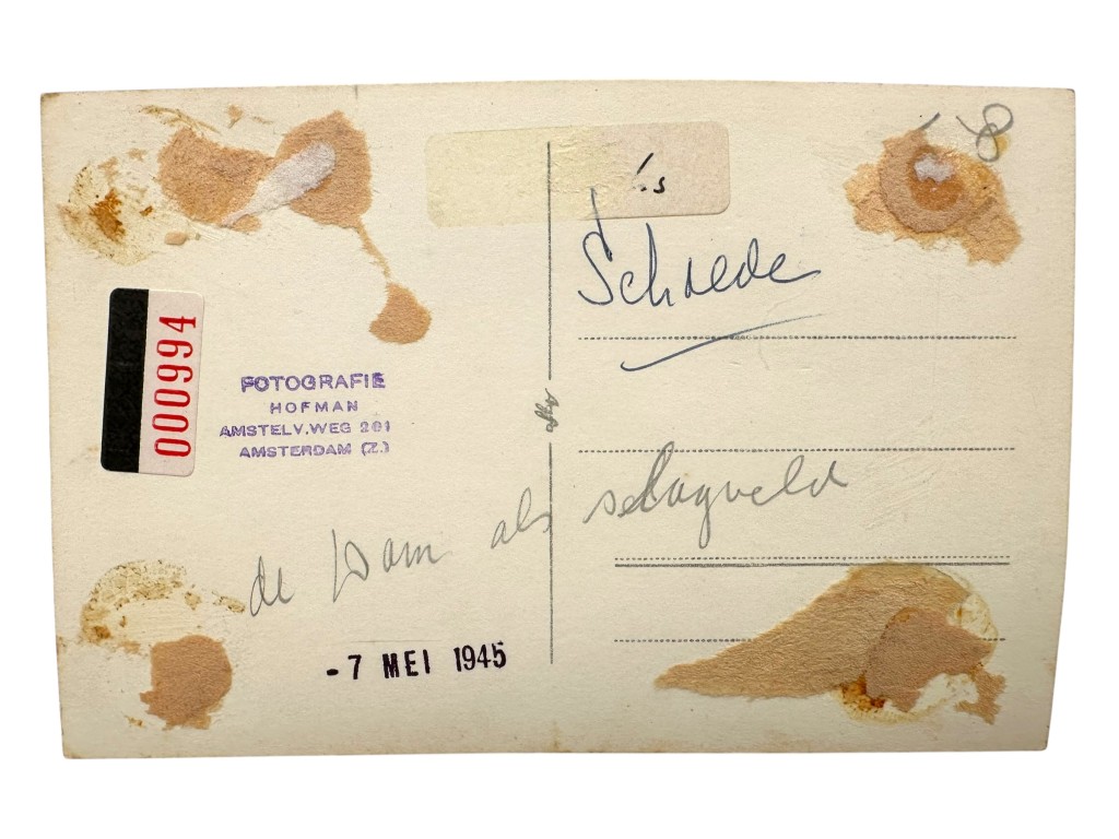 De achterzijde van de foto is voorzien van een datumstempel “7 Mei 1945” en een stempel van Fotografie Hofman uit Amsterdam.