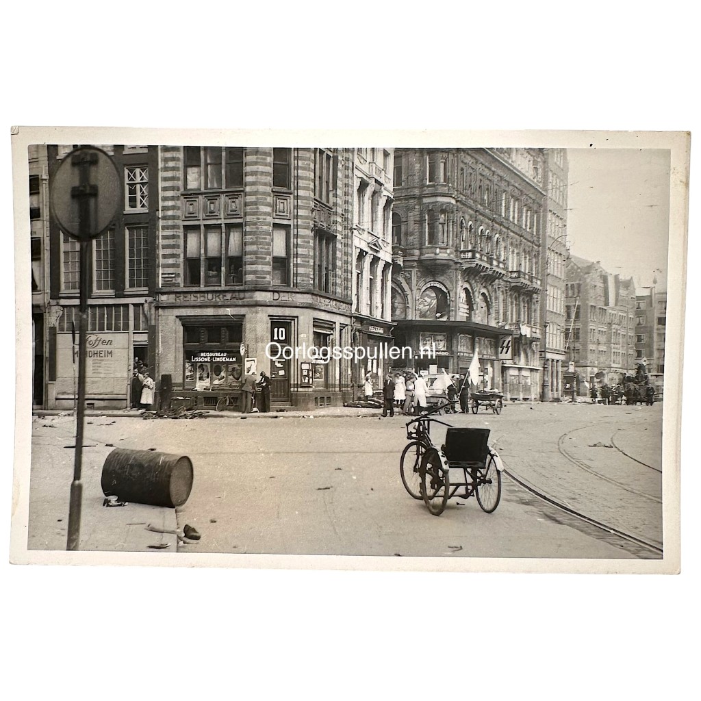 Een zeldzaam en indrukwekkend origineel fotografisch document uit de bevrijdingsdagen van 1945 dat sterk verbonden is met de geschiedenis van Amsterdam en Nederland.