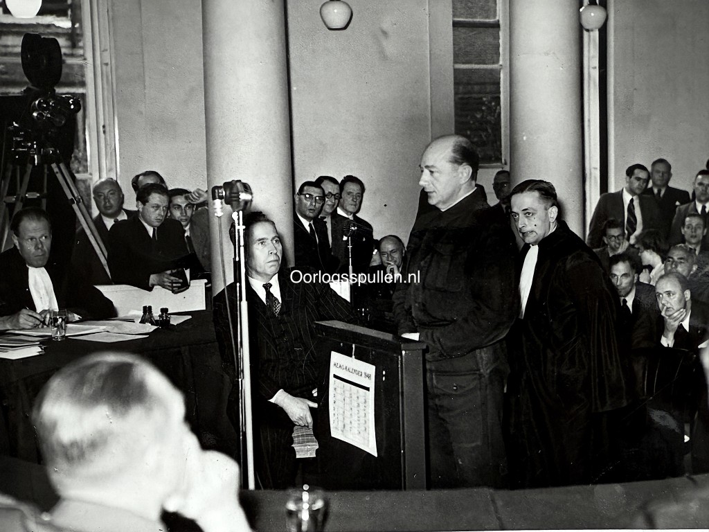 Deze zeldzame foto uit de periode direct na de Tweede Wereldoorlog, genomen tijdens het proces tegen SD-Sturmbannführer Joseph Schreieder. Schreieder stond aan het hoofd van de Sicherheitsdienst (SD) in Den Haag en speelde een beruchte rol in het zogeheten “Englandspiel” (1942–1944), waarbij tientallen geallieerde geheim agenten na hun droppings in Nederland werden gearresteerd en vaak gefusilleerd.