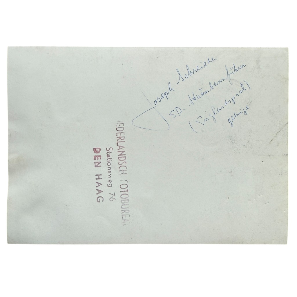 Op de achterzijde bevinden zich aantekeningen met zijn naam en functie, evenals het stempel van het Nederlandsch Fotobureau, Den Haag.