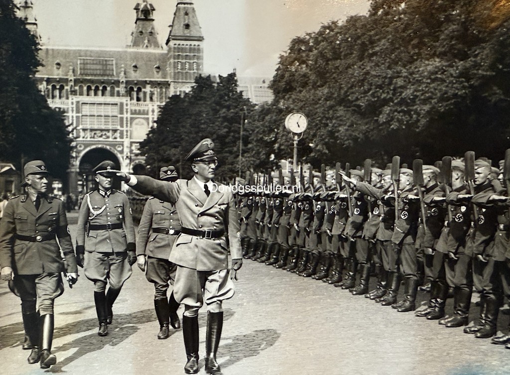 Originele Nederlandse foto uit de Tweede Wereldoorlog die een officiële inspectie van leden van de Reichsarbeitsdienst vastlegt nabij het Rijksmuseum in Amsterdam. Op de voorgrond zijn onder anderen rijkscommissaris Arthur Seyss-Inquart en Reichsarbeitsführer Konstantin Hierl te zien, terwijl zij langs de strak opgestelde manschappen lopen. De foto toont een indrukwekkend moment uit de Duitse bezetting van Nederland, waarbij de militaire discipline en machtsvertoon duidelijk naar voren komen tegen de herkenbare Amsterdamse achtergrond. Het betreft een authentieke zwart-witfoto met een formaat van 18 x 13 cm. Een zeldzaam verzamelobject voor verzamelaars van WOII-fotografie, bezettingsgeschiedenis en Nederlandse historie.