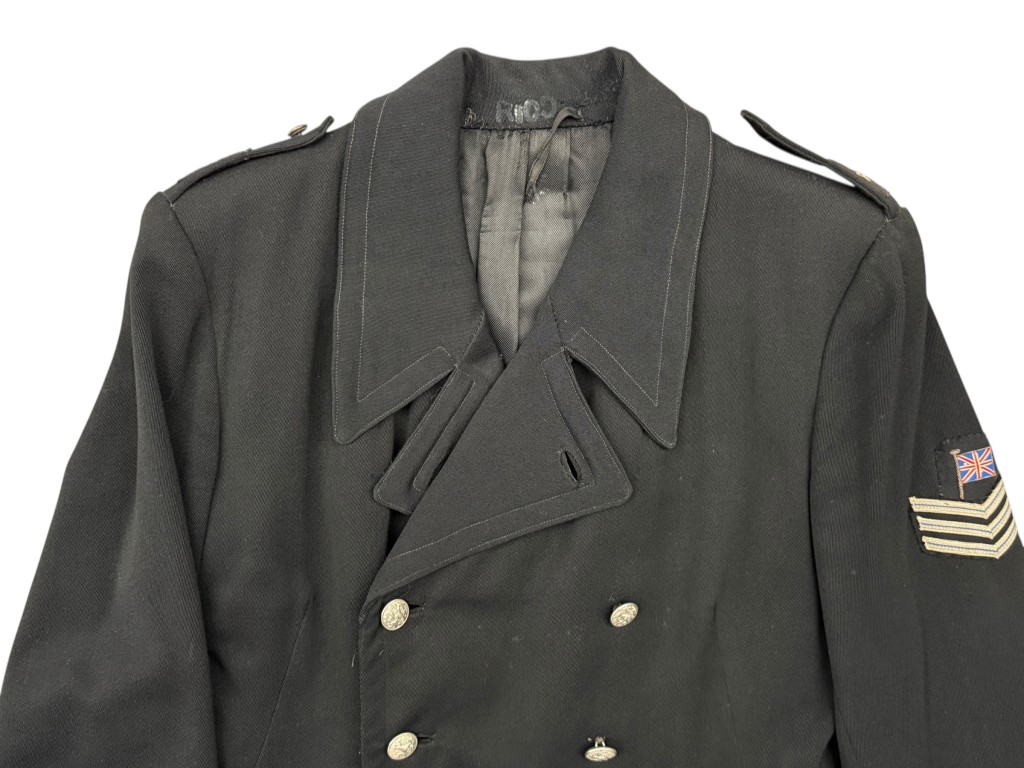 De jas heeft een dubbele rij metalen knopen met het Nederlandse wapen, epauletten met rangstrepen, en op de mouw een embleem met de Britse vlag, wat aangeeft dat de drager na de bevrijding ook als tolk of vertaler fungeerde voor geallieerde troepen.