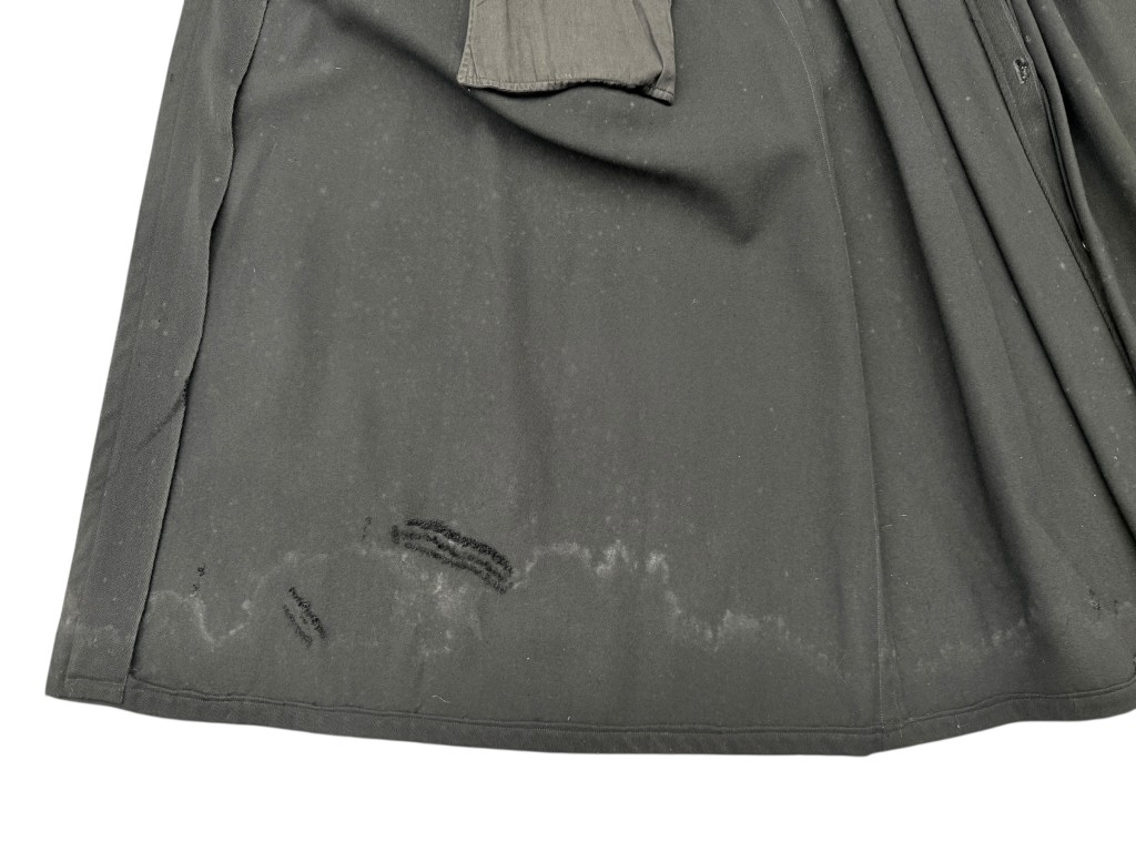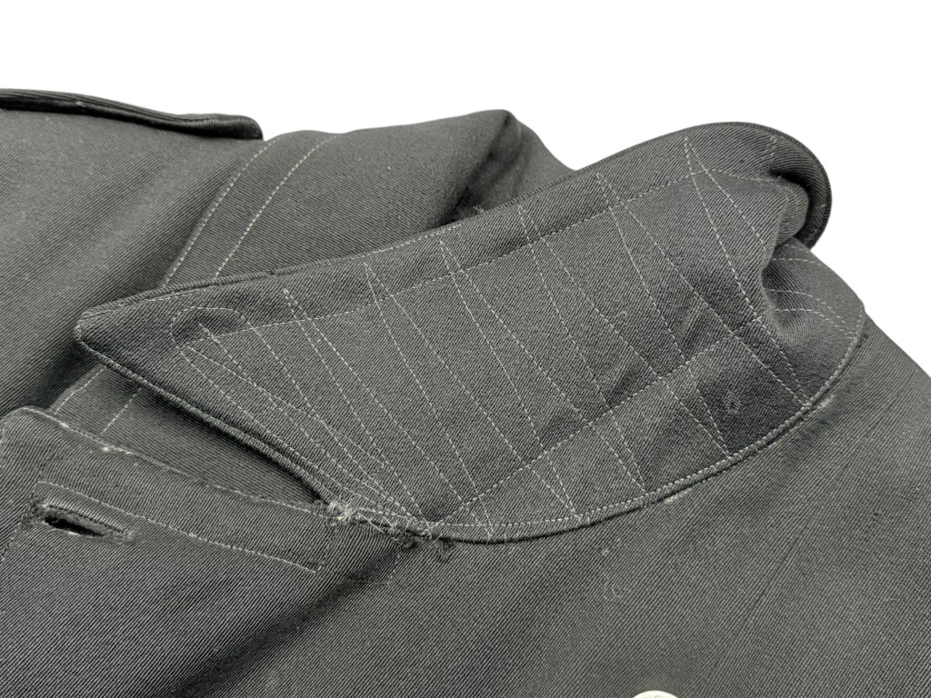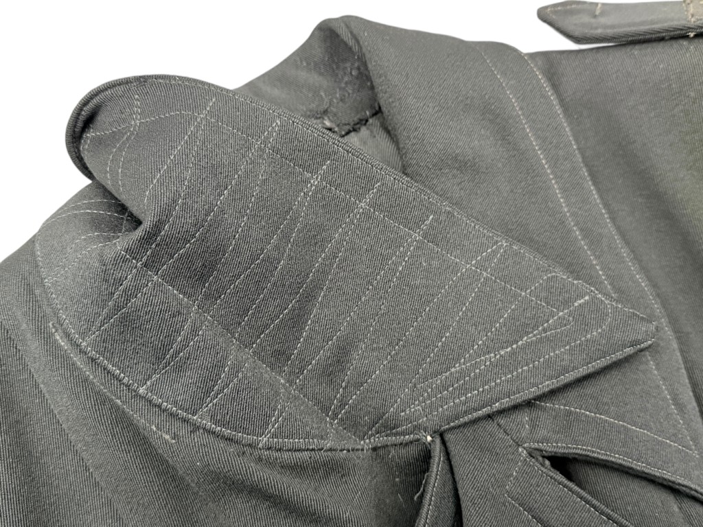 De overjas is vervaardigd uit zwarte wollen stof met een fijne keperbinding (serge-weefsel), herkenbaar aan het subtiele diagonale patroon dat zorgt voor stevigheid en een klassieke uitstraling.